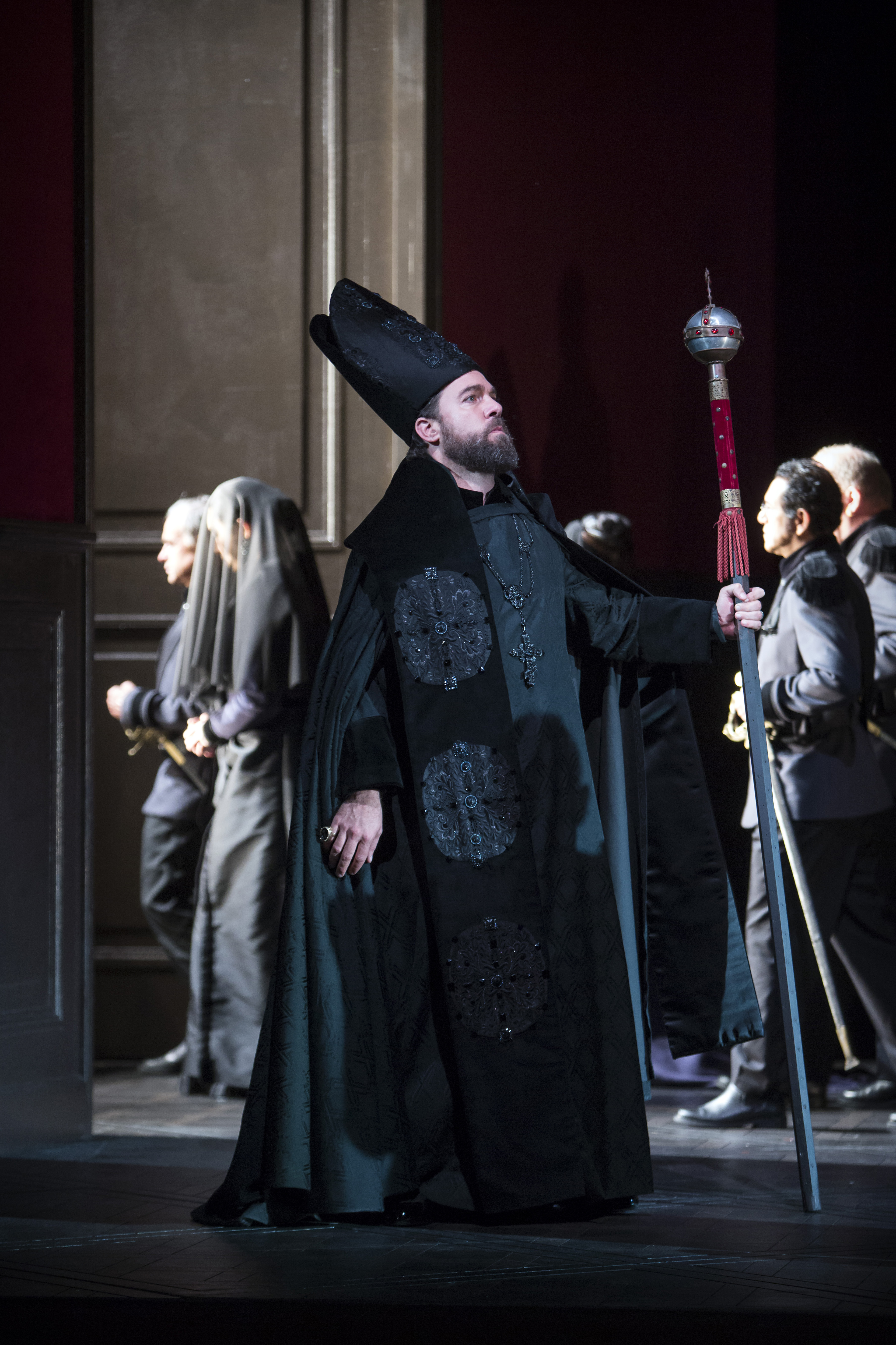 We had a psychologically complex Posa from Nikolay Borchev. He gave us a portrayal of a man, desperate to be taken seriously – which made his motivation for grabbing Carlo’s sword in the auto-da-fé even more believable. His is a lighter baritone than we often hear in the piece and the tone was somewhat narrow, lacking a full range of tone colours in order to allow him to exploit the text. He’s the owner of a fine legato and he threw himself into Berloffa’s vision of the role.