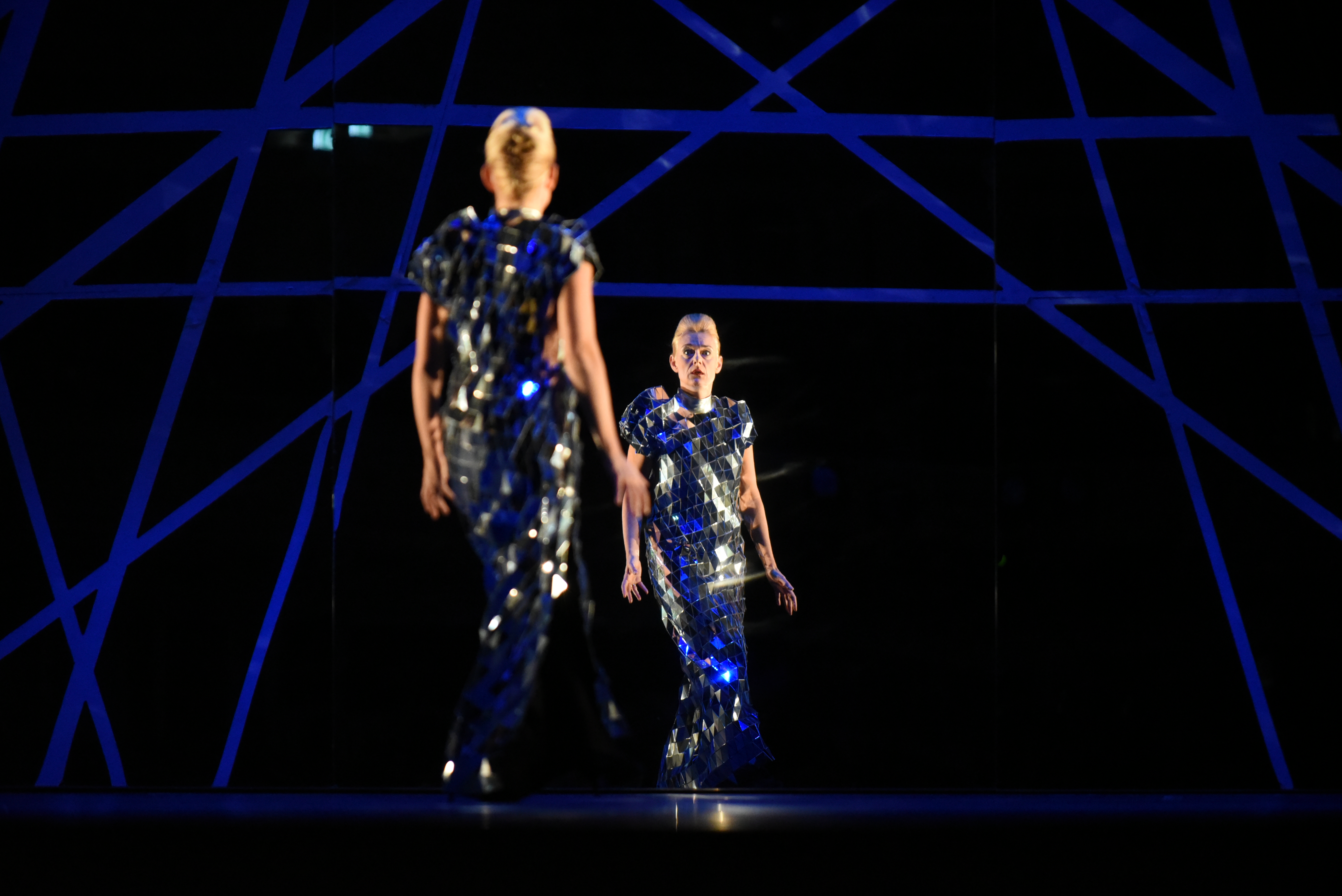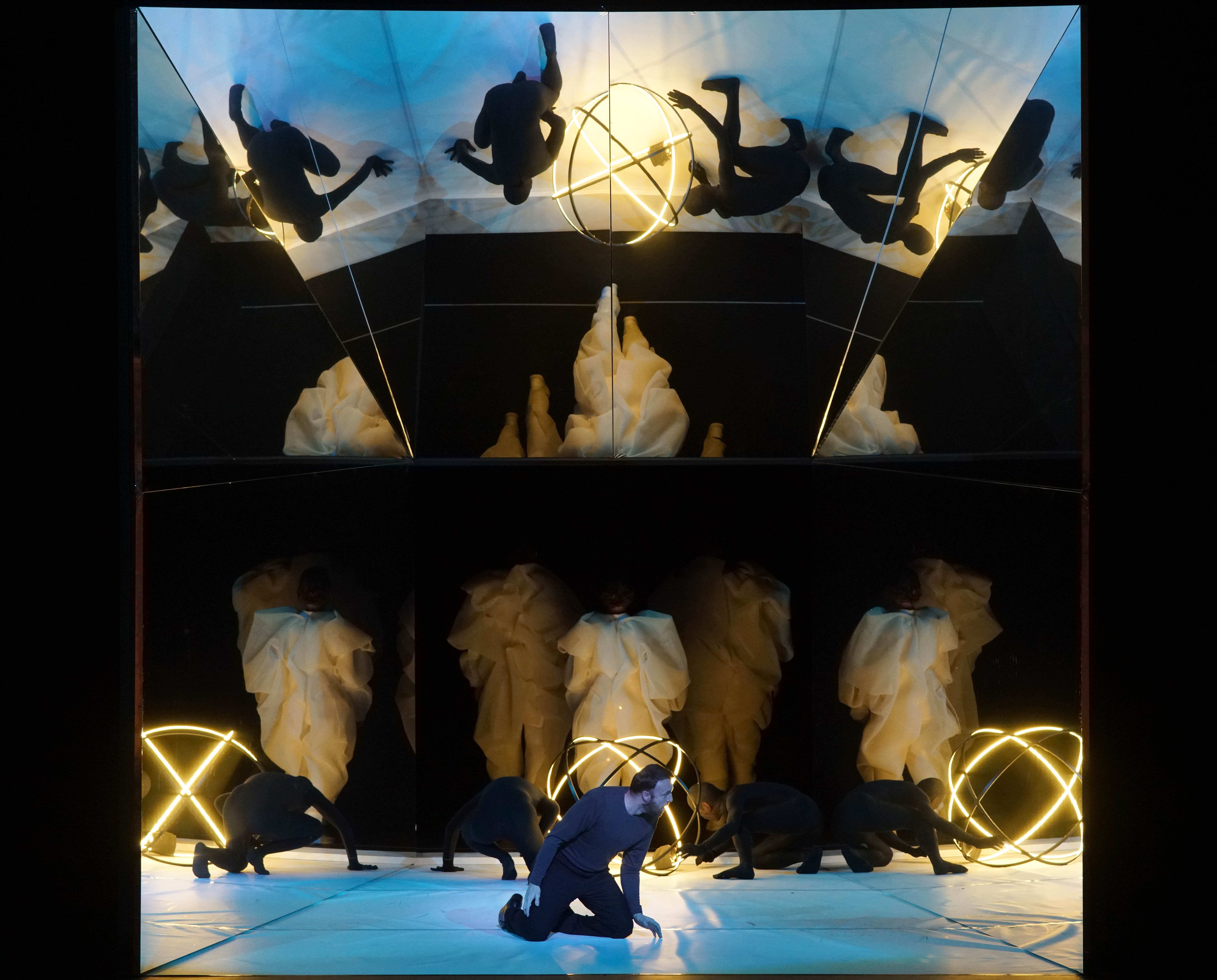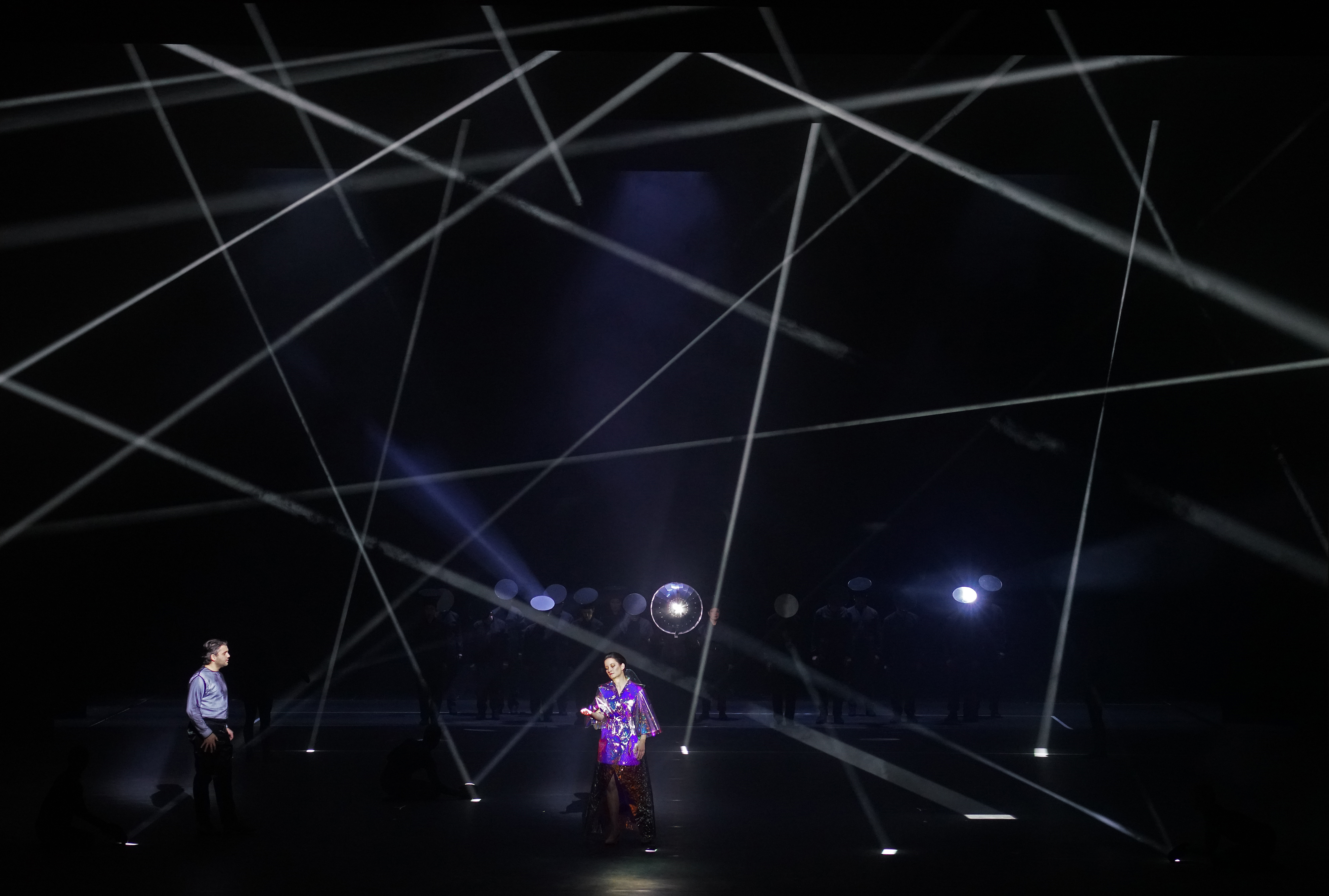 What we got was a futuristic vision of a story set in antiquity. In an interview in the extensive program book, Elíasson mentions a discomfort with the term ‘gesamtkunstwerk’, preferring instead to see this production as a ‘social-democratic space’. Indeed, in many respects, it’s a three-way collaboration between Collins’ direction and choreography, Elíasson’s light installations, costumes and set, and Rattle’s conducting. There’s an openness here, a bringing together of diverse art forms, that I found most interesting. It struck me that the act of experiencing this show as a spectator, was very much a sense of being immersed. Immersed in these remarkable light installations, but also immersed in the irresistible rhythmic impetus of Rameau’s fabulous music. What Elíasson achieved was staggering – bathing the room in a glow of light that pulled the audience in. The lights were used as much in the way of regie as the direction of the principals themselves, guiding the action and making it live. The image of the Temple of Diane, composed of interlocking streams of light, so simple yet so visually ravishing, was just captivating. In Act 2, a highly impressive coup de théâtre transformed a mirror image of the audience in the theatre almost imperceptibly into a visually mesmerizing view of the underworld. The visual effects frequently left me open-mouthed in awe of their beauty, as well as their technical skill.