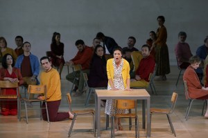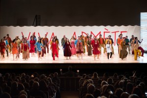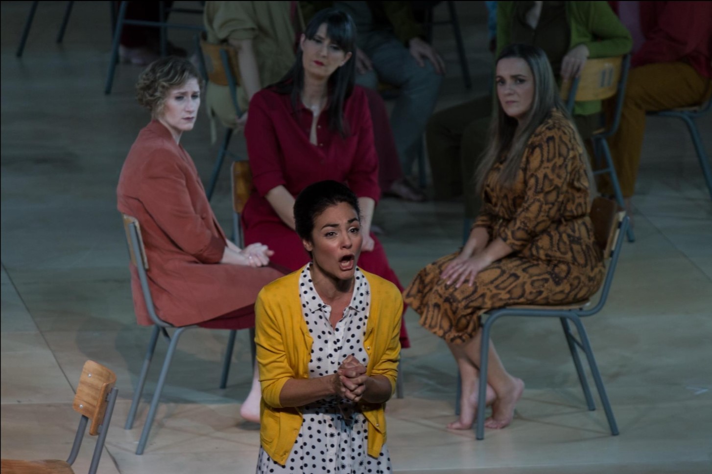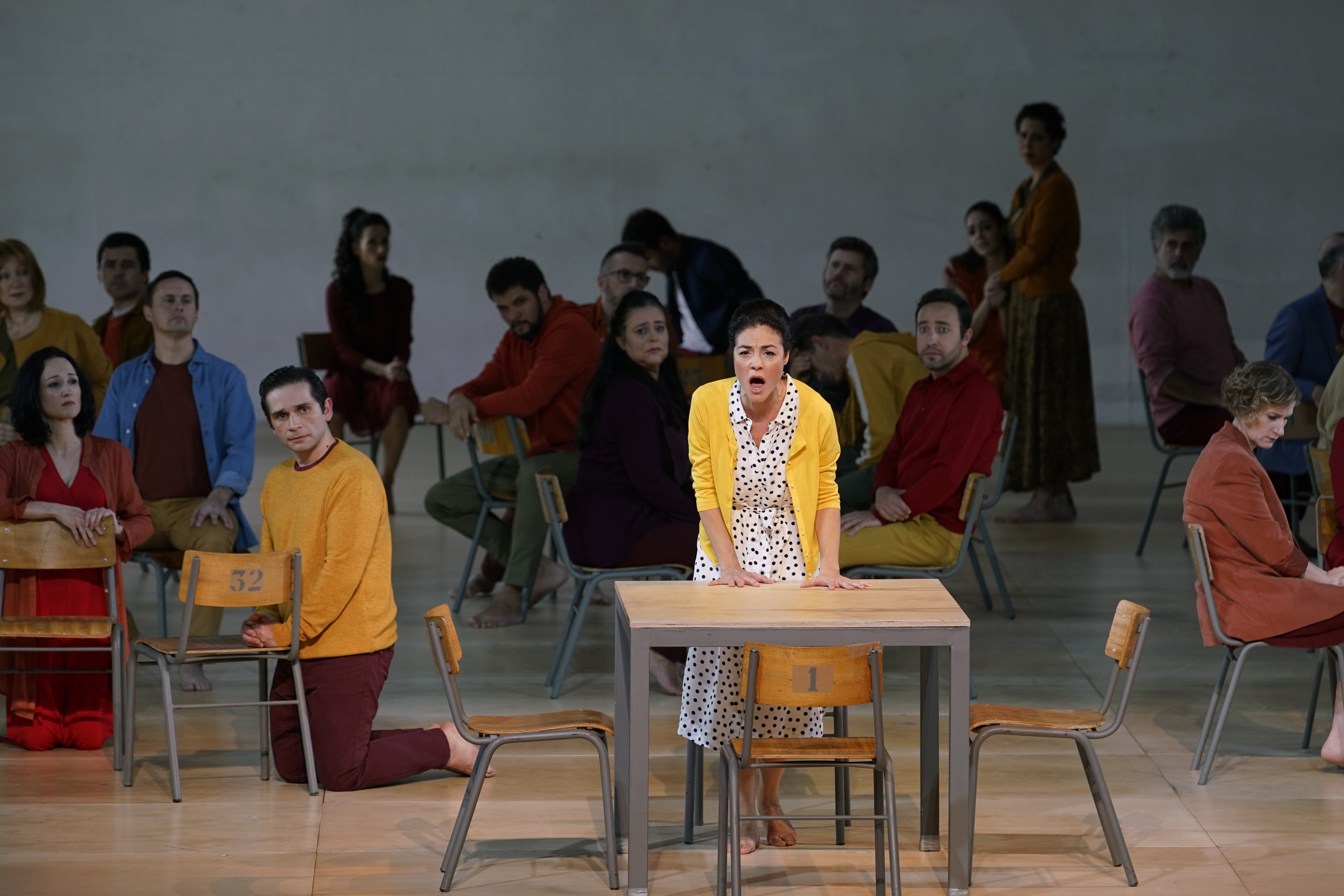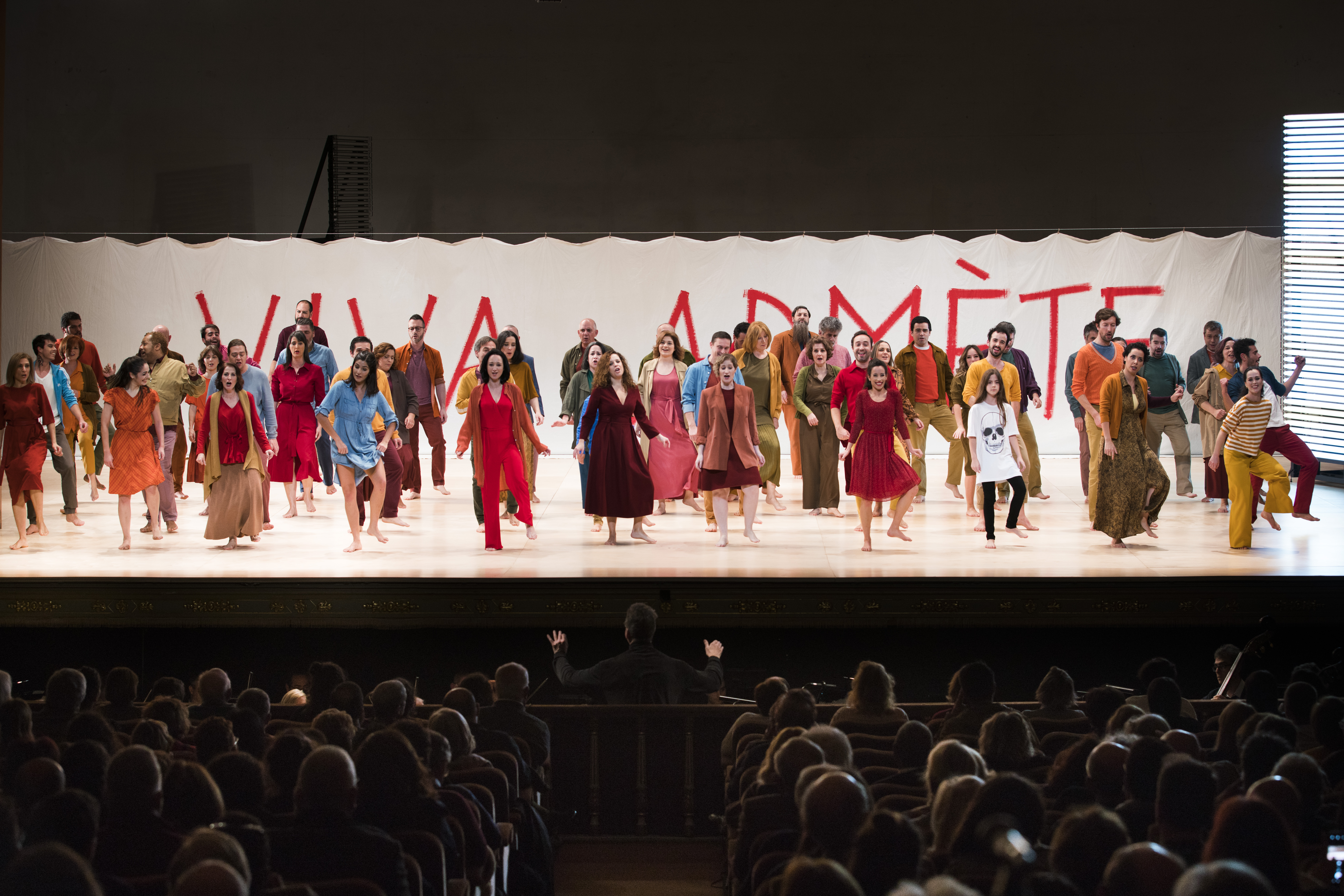 What is an opera performance if nothing other than an act of recreation? Indeed, no two live performances can ever be the same. Even two performances in the same run with the same cast, can differ from one evening to the next. Every staging, every evening, involves a process of creating a work anew, from scratch. Graham Vick’s new production of Alceste for the Teatro Nacional de São Carlos takes this idea as a starting point, quite literally, as the audience is confronted on entering the auditorium by what appears to be a rehearsal room, complete with empty coffee cups on a table with a few chairs. The chorus members (as much of a protagonist in this work as the principals), enter by carrying in their own chairs. The cast very much engage in precisely that act of recreation right in front of us, transforming this blank canvas into a living piece of theatre. The costumes (Conor Murphy) seem to reflect that rehearsal setting, all pastels with a relaxed, casual look.