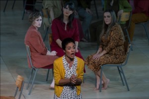 Where Vick’s staging succeeds is in its precisely intricate personenregie, creating clearly identifiable flesh and blood characters. The chorus was composed of clearly recognizable individuals, whether as a mass acting together, or attending what appeared to be group therapy sessions. In Act 2, they busted some fierce moves, bringing out the celebration of Admète’s recovery. This was very much a performance that lived through the text. Diction was absolutely clear throughout the entire cast, with the result that this was an evening that lived both in what we saw, through the physical manifestation of the characters, and in what we heard. The cast had obviously been directed with great care and they threw themselves (often quite literally) into everything asked of them.