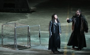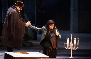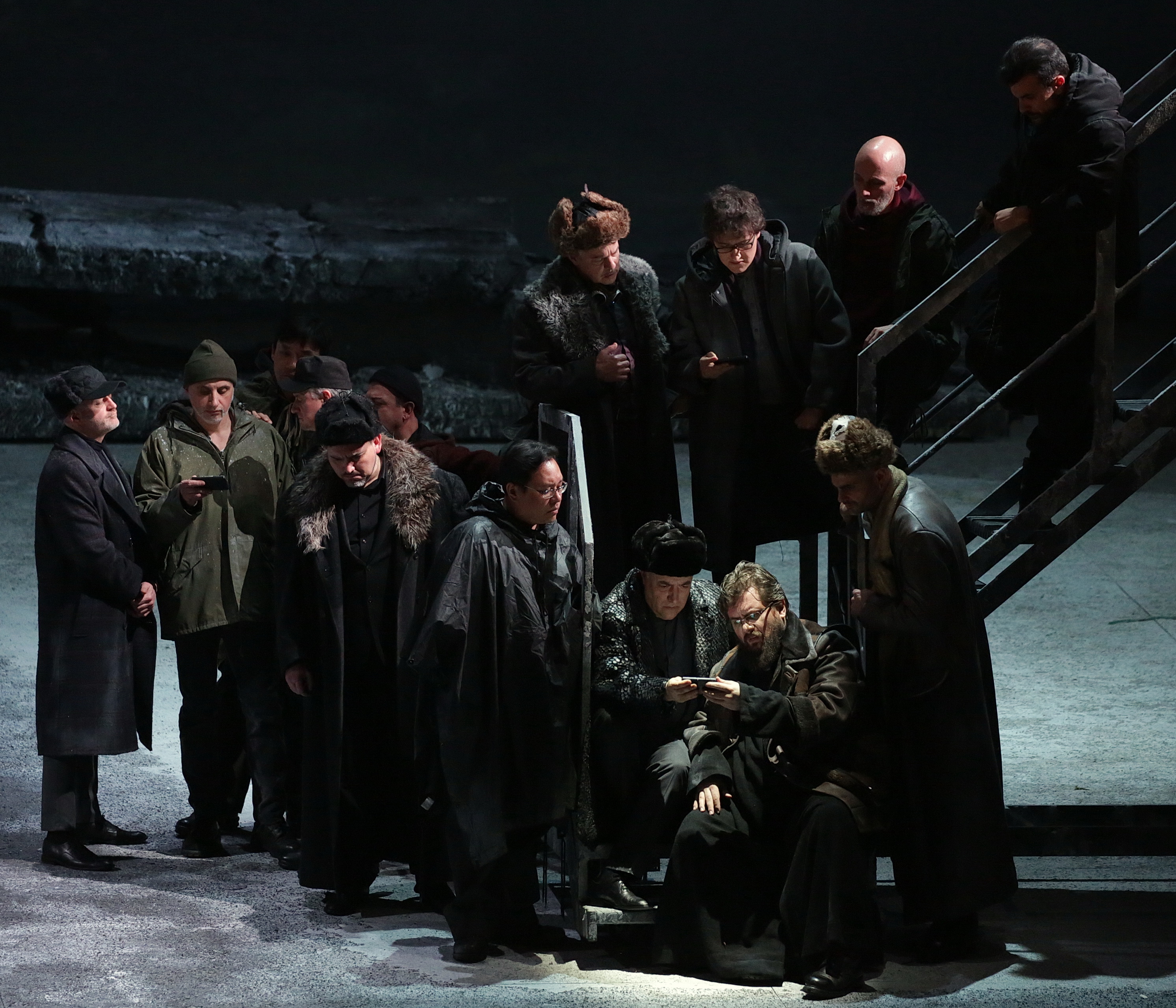 Where Martone succeeds is in transforming this quite complicated story into a coherent theatrical narrative, even if along the way some of the personenregie might feel perfunctory.  For such a visual staging, it must be admitted that there was some standing and delivering, with a fair bit of declaiming with arms outstretched and singing to the front.  While there were moments in which the chorus was parked at the front, Martone also used this to create a most haunting image during the Act 3 prayer – the rows of people standing still during the poignant a cappella section was deeply moving.   The presence of a mysterious woman, presumably the historical figure of the Regent Sofia Aleseyevna, assists in bringing an additional dimension to the narrative, reinforcing that idea of shadowy forces working behind the scenes.  Similarly, the sight of Ivan greeting the crowds in handcuffs from a prison cell at the end of Act 3 adds an interesting idea – the idea that his desire to promote harmony among the people could have been the result of coercion.   It certainly made the idea of Ivan being under house arrest in Act 4 one that felt especially convincing.  Martone keeps a visual coup for the final scene.  No spoilers here, but it did find several audience members pulling out their smartphones to photograph it.