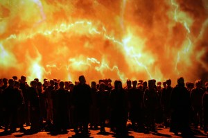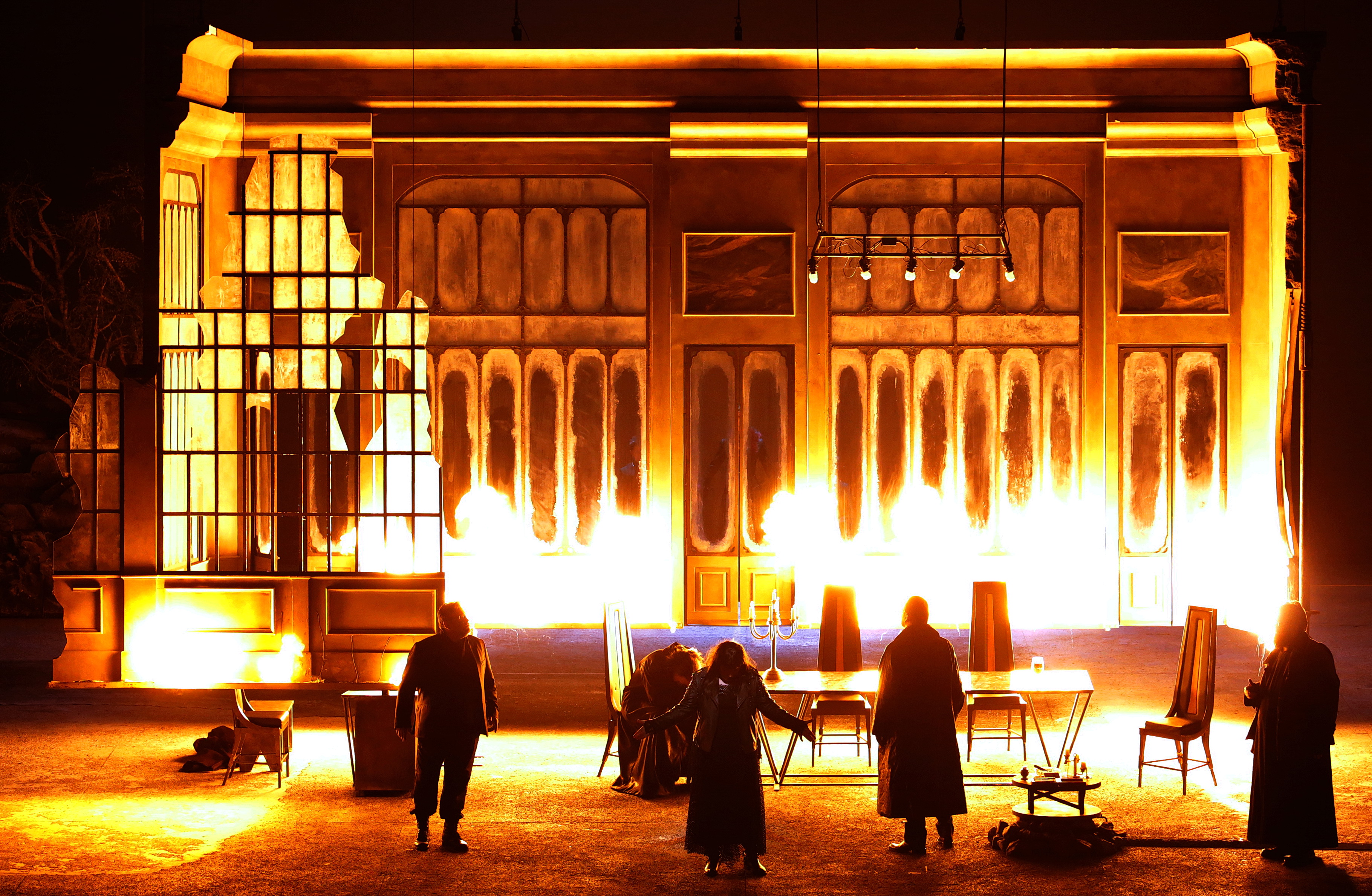 As might be expected, Martone gives us a very visual staging, creating some extremely memorable stage pictures.  Martone’s staging is clearly the work of an artist with a great visual imagination who knows precisely how to use the tools at his disposal to create a theatrically compelling spectacle.  The curtain rose an urban wasteland, a place clearly recovering from trauma, where the old rules no longer apply.  Over the course of the next four and a half hours, Martone and the cast take us into a futuristic vision of dystopia, where shadowy figures wield great influence and where leaders who appear powerful, actually have no power at all.  The sets (Margherita Palli) are seriously impressive – from the wreckage of an overpass in Act 1, to the villa in Act 2 that goes up in flames.  The thread through the evening is the video backdrops by Italvideo Service.  Whether providing images of bombed-out shadows of buildings in the distance or flying birds that Ivan tried to shoot at, they provided some extremely striking backgrounds and contributed to making those stage pictures so memorable.