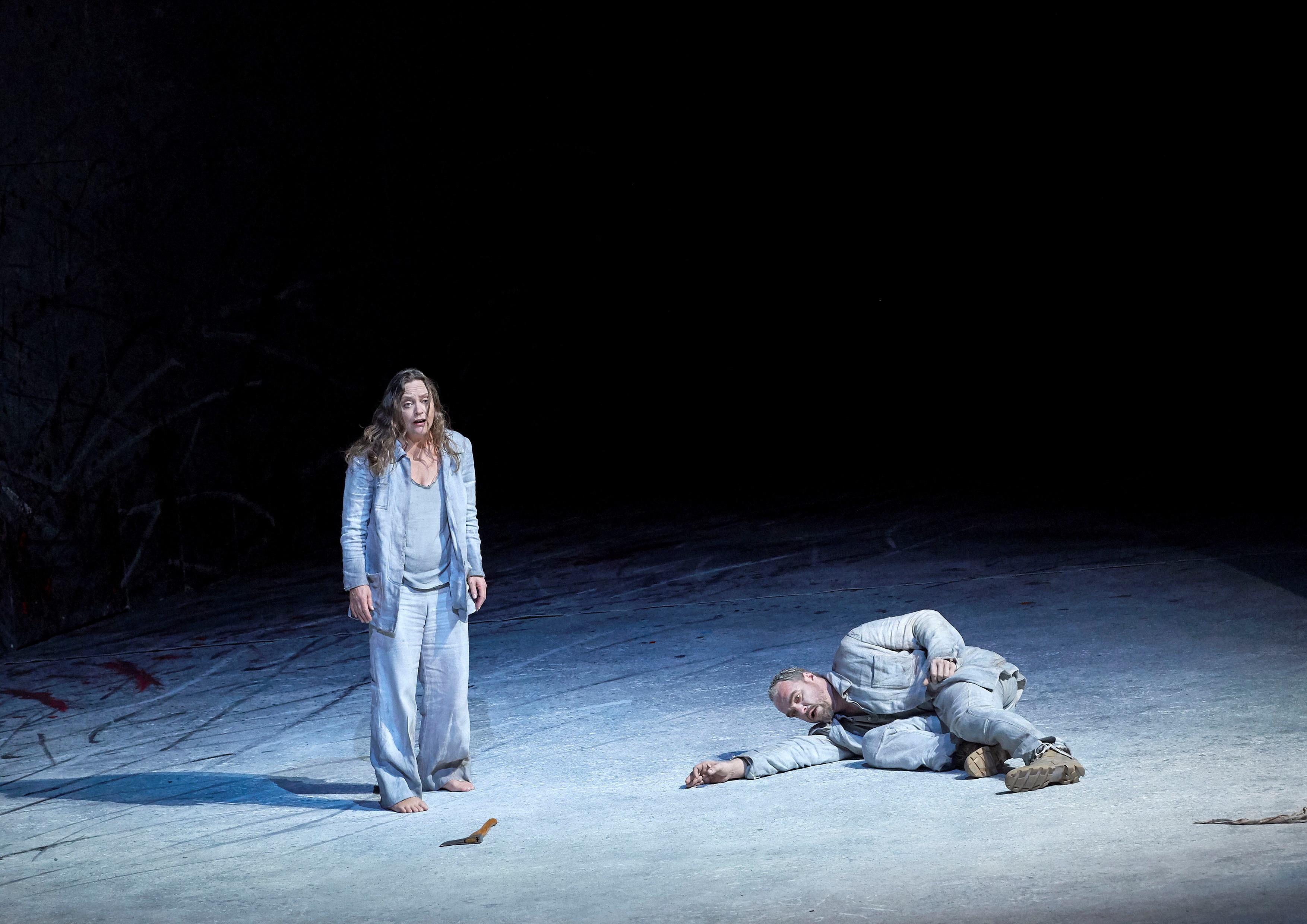 Trojahn gives us a ‘Musiktheater’ in six scenes to his own libretto. It portrays Orest as a tortured figure, haunted by his own actions, while Elektra is hell-bent on continuing her murderous obsession, this time aimed at Helena and Hermione. It’s a high-octane ride, building in inexorable tension throughout its eighty-minute running time. Trojahn creates a fascinating sound world. An off-stage vocal consort is amplified from speakers scattered around the auditorium, with cries of ‘Orest’ at leaping intervals, the sibilants echoing around in space. Trojahn also gives us intricate string writing, from barely perceptible harmonics to deep, extended visions of the pits of despair. Throbbing percussion pulsates the action forward, jabbing with the sharpness of that all-threatening axe. Each character has his or her musical language – for Elektra it’s violent edginess, for Helena, melismatic dreaminess. The orchestration has moments of extreme delicacy, as in a haunting lullaby for Elektra, but it’s also extremely thick in places, meaning that Thomas Johannes Mayer’s Orest was pushed to the extremes. The vocal writing is fiendishly difficult – full of leaps across the registers – but the entire cast had clearly been exceptionally well prepared, making it sound like the easiest thing in the world.