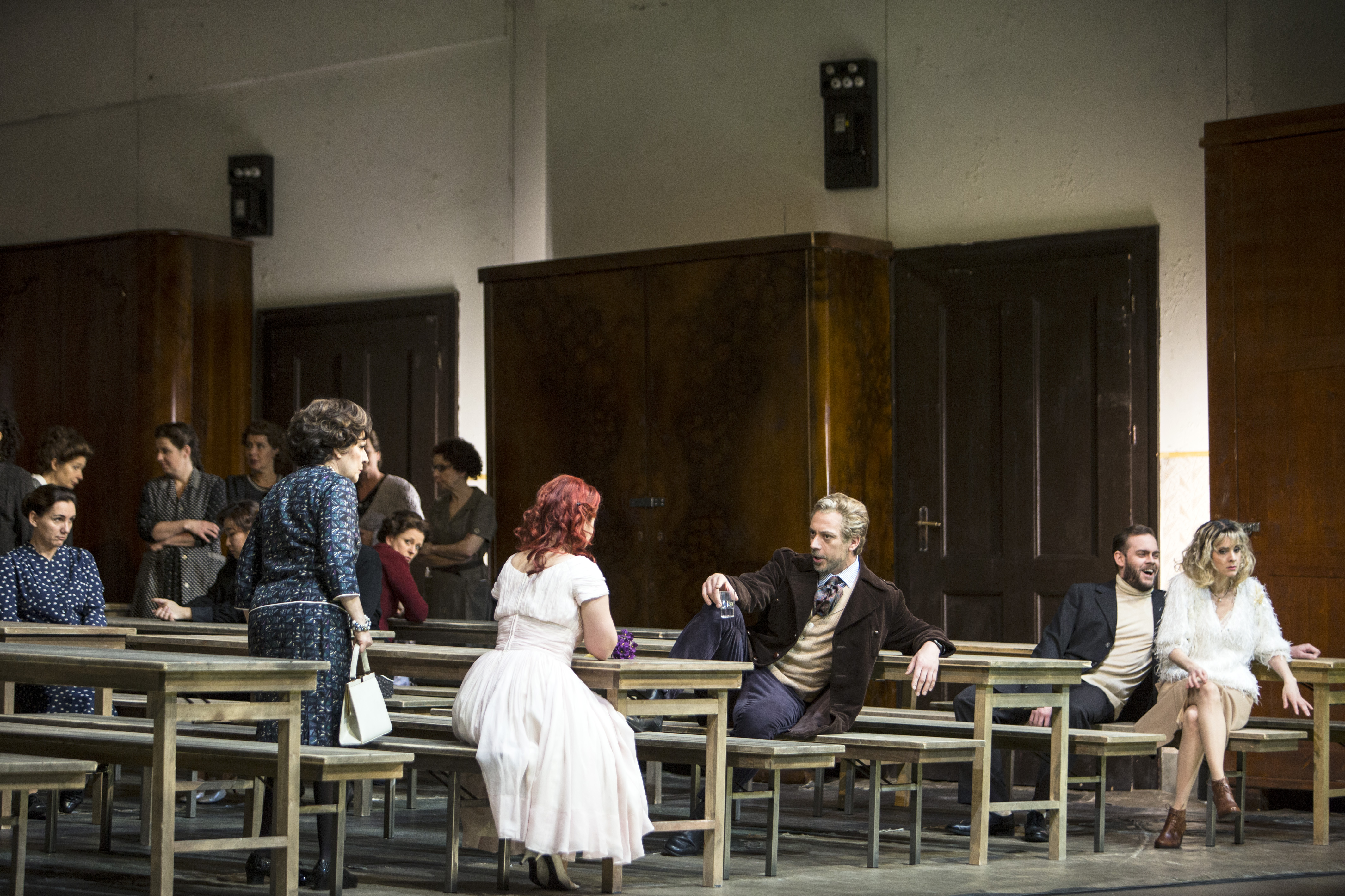 For their staging of La sonnambula, originally produced in Stuttgart but here revived at the Deutsche Oper, the directing team of Jossi Wieler and Sergio Morabito have updated the piece to the 1970s. Set in a closed community, where everyone knows everybody else’s business, it makes for an interesting setting for the work. Particularly so as the 1970s were a time of sexual liberation, following the sexual revolution of the preceding decade. They start off with a strong premise – that Elvino and Amina’s relationship is a lot more physical than might have been the case in the early nineteenth century, when the work was originally produced. We see the couple engaging in quite active intercourse during the Act 1 love duet, and Lisa is also a lot more physically liberated than we often see. Similarly, Rodolfo was more than ready to take advantage of Amina when she sleepwalked into his room at night.
