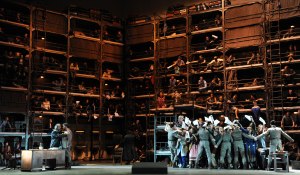 As the curtain rose on tonight’s revival of Andreas Kriegenburg’s 2010 production of Otello at the Deutsche Oper Berlin, the audience was greeted by an imposing, proscenium-high vista of the interior of a ship, seemingly full of refugees. Kriegenburg has created a world in microcosm, full of anonymous people who go about their daily business under the supervision of the officers who oversee them. It makes for a very interesting setting for the work – albeit one that perhaps raises more questions that it answers. Jago is seen plotting openly in front of the people, being watched singing his ‘credo’ surrounded by a group of children. It raises questions regarding power and agency – if these people are aware of what is happening, why don’t they intervene? These are people who observe yet never participate.