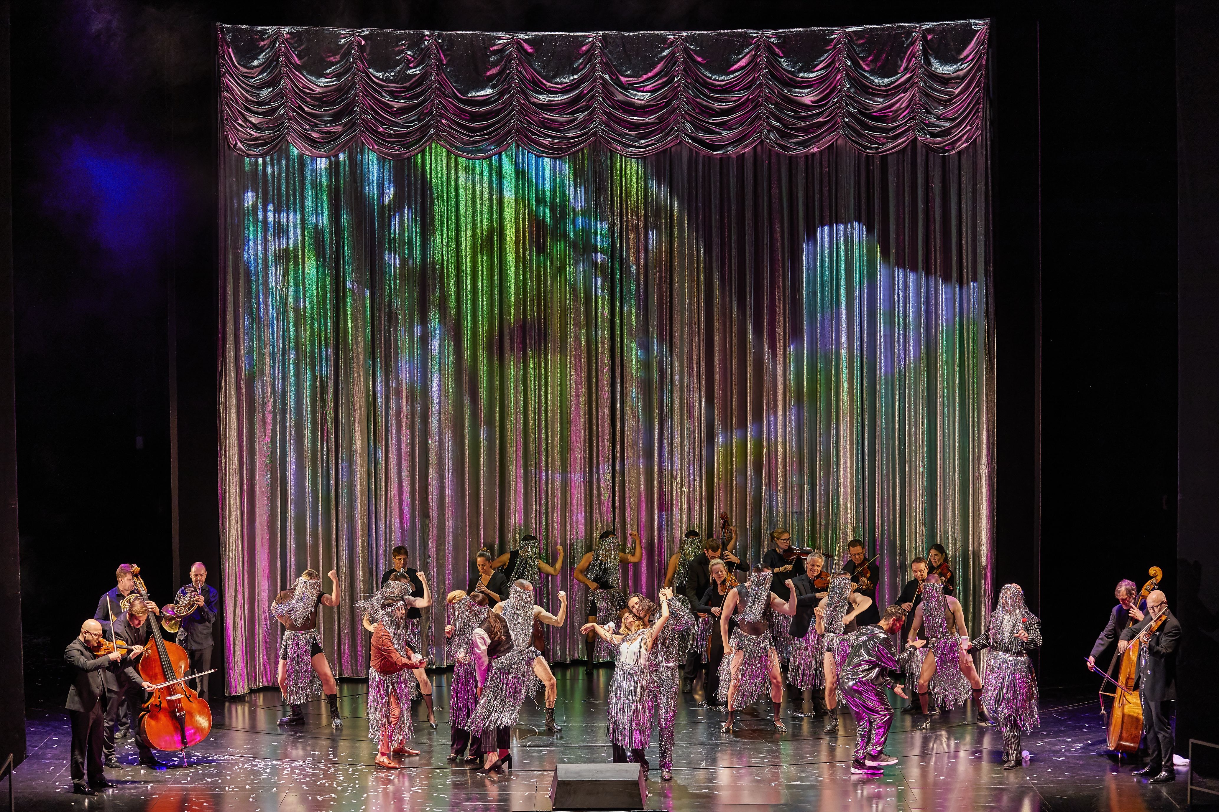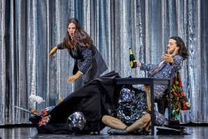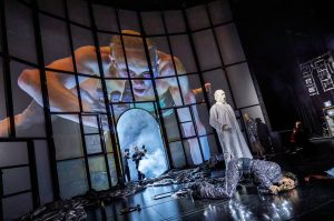 During the course of the evening, Bosse also introduced a new character ‘Amor/Tod’ in the shape of actress and frequent Bosse collaborator, Anne Müller. She was a constant presence in Act 1, opening windows, painting graffiti with the total number of Giovanni’s conquests, and inviting musicians from the pit to the stage to provide the stage music. And yet, in Act 2, she seemed to disappear, only to return in the closing scene as a pale vision dragging Giovanni to hell. I’m not entirely convinced she added much to proceedings, though her energy, constantly moving in Act 1 and also body popping to the music at times, was impressive.