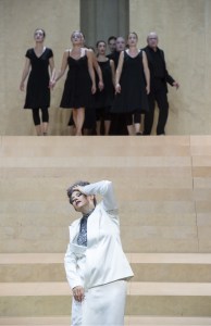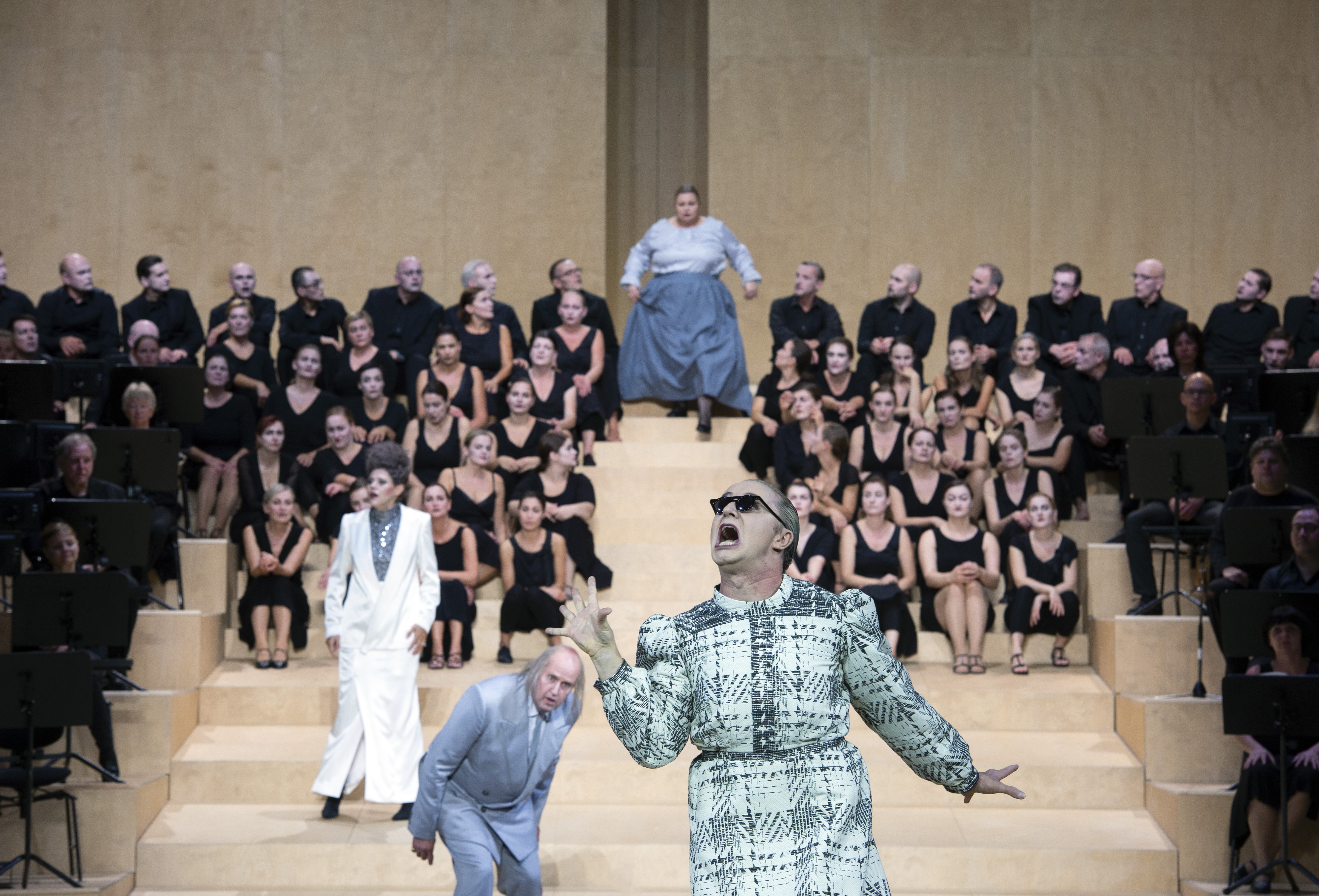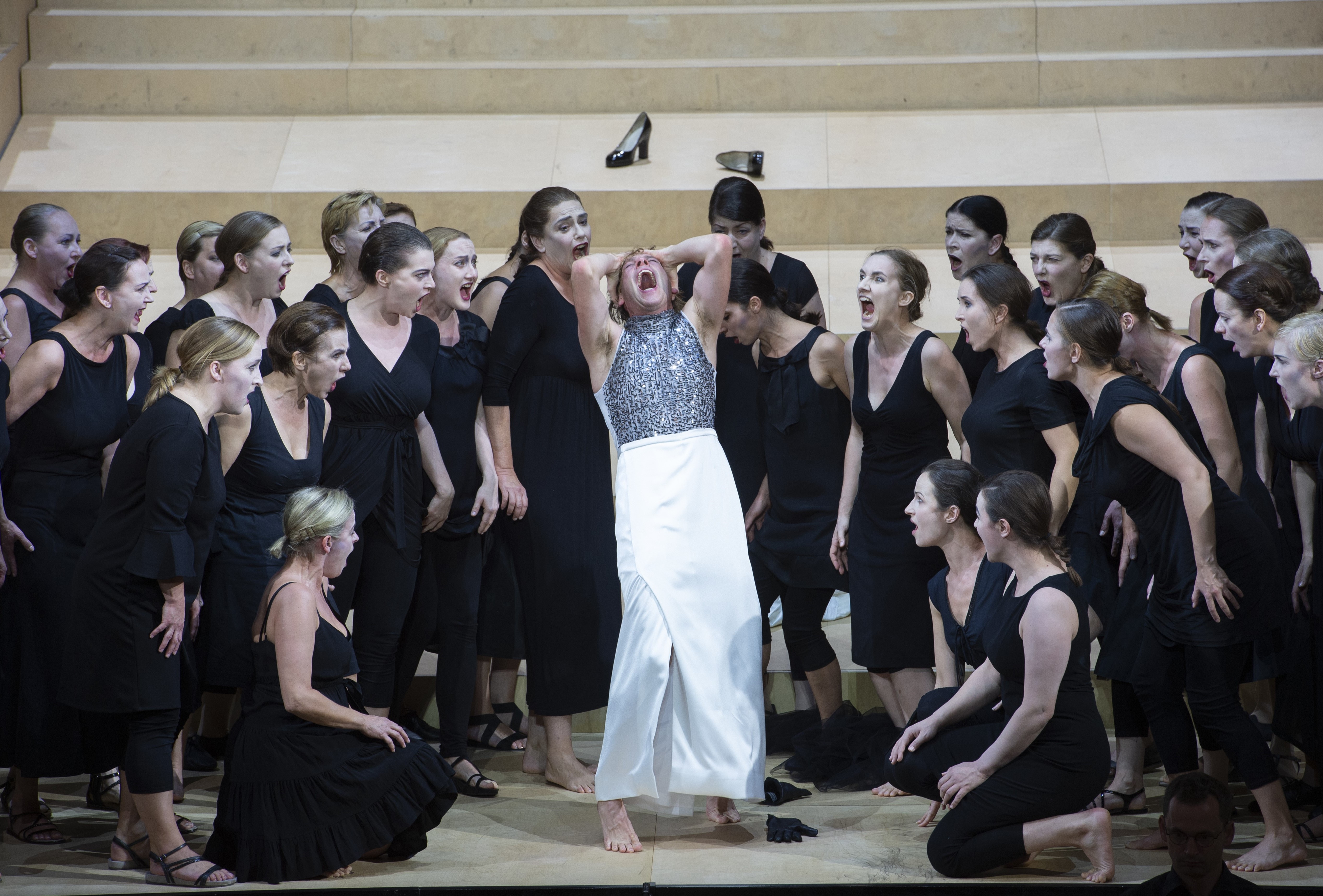 The production was assigned to the house’s Intendant, Barrie Kosky. He set the action in a single set (Katrin Lea Tag), consisting of a simple staircase with two balconies on the side. The action also expanded into the auditorium with a lip in front of the orchestra pit where characters sang from but also where the ballet corps indulged in some dizzyingly exciting choreography. It had many of Kosky’s trademarks (though it’s tempting to call them clichés by now). The staircase that the chorus had to run up and down, the exacting choreography for the chorus, pointing and shaking hands in the air, as well as men in dresses (though this was actually mandated by the libretto). It did all feel rather déjà vu. Where I felt an issue with Kosky’s staging was that it felt very much a superficial exploration of the characters’ motivations. There were hints of the conflict between the uptight leader and the charismatic cult head. Yet, rather than a sense of flesh and blood individuals negotiating situations of life and death, it felt rather cold, despite some seriously impassioned individual performances. It always felt that we were observing from without, rather than being invited or provoked to delve deep into individuals’ psychological states. Perhaps you could say that was the point, that Kosky was attempting to recreate something of the spirit of Greek theatre. It’s just that I longed, and not for the first time with him, for something deeper. To be made to feel. Instead, I was left with admiration for the dedication of the cast in their unstinting execution of their movements.