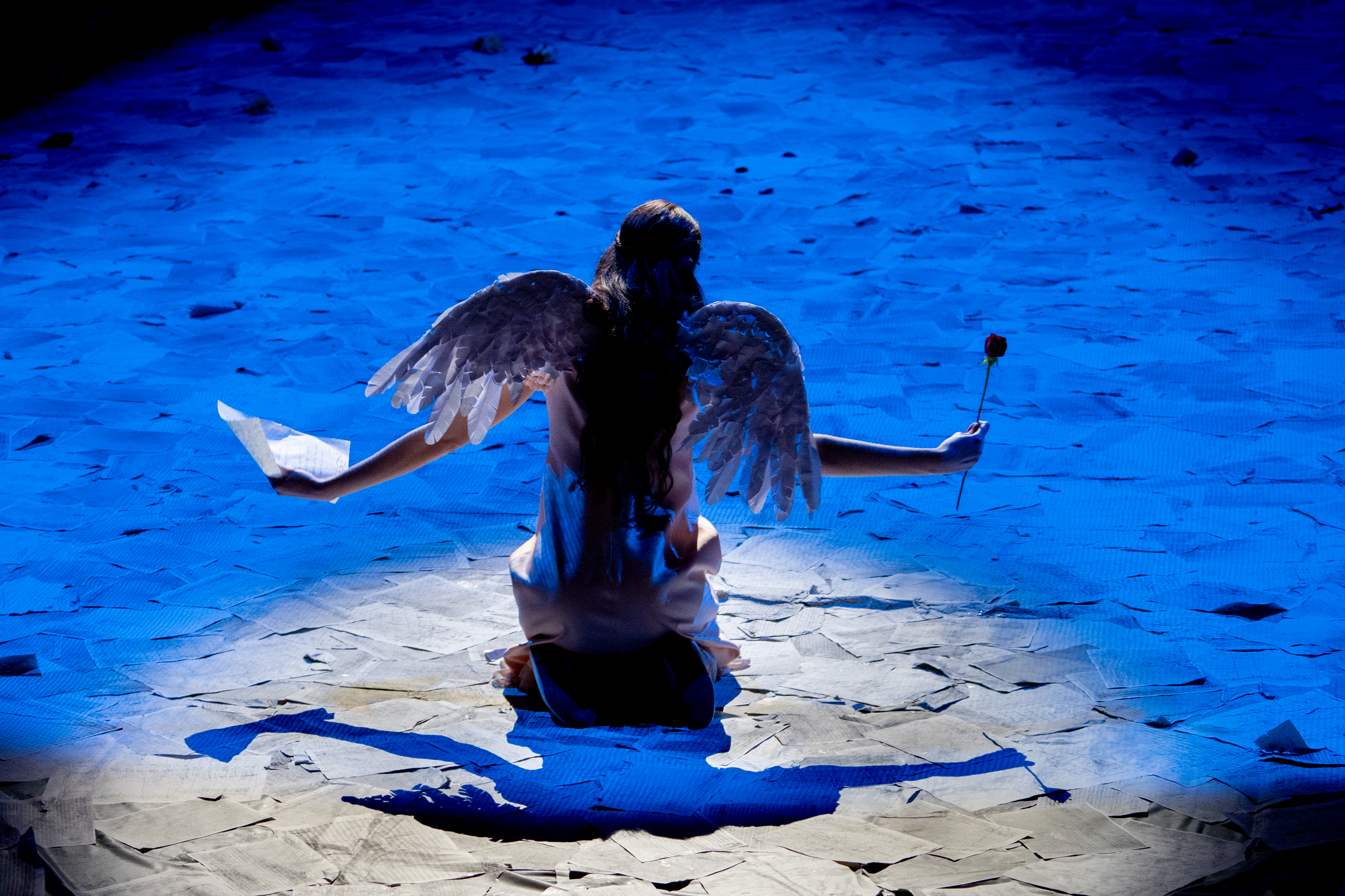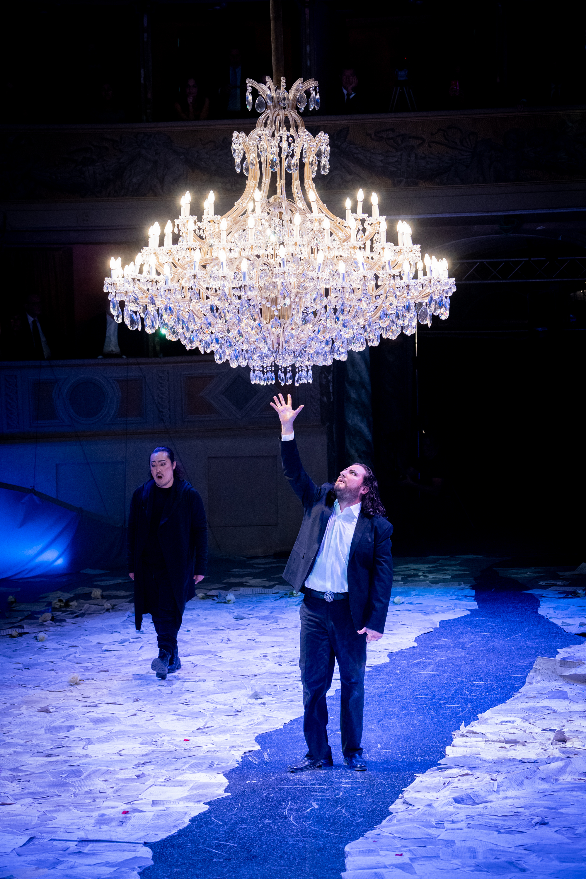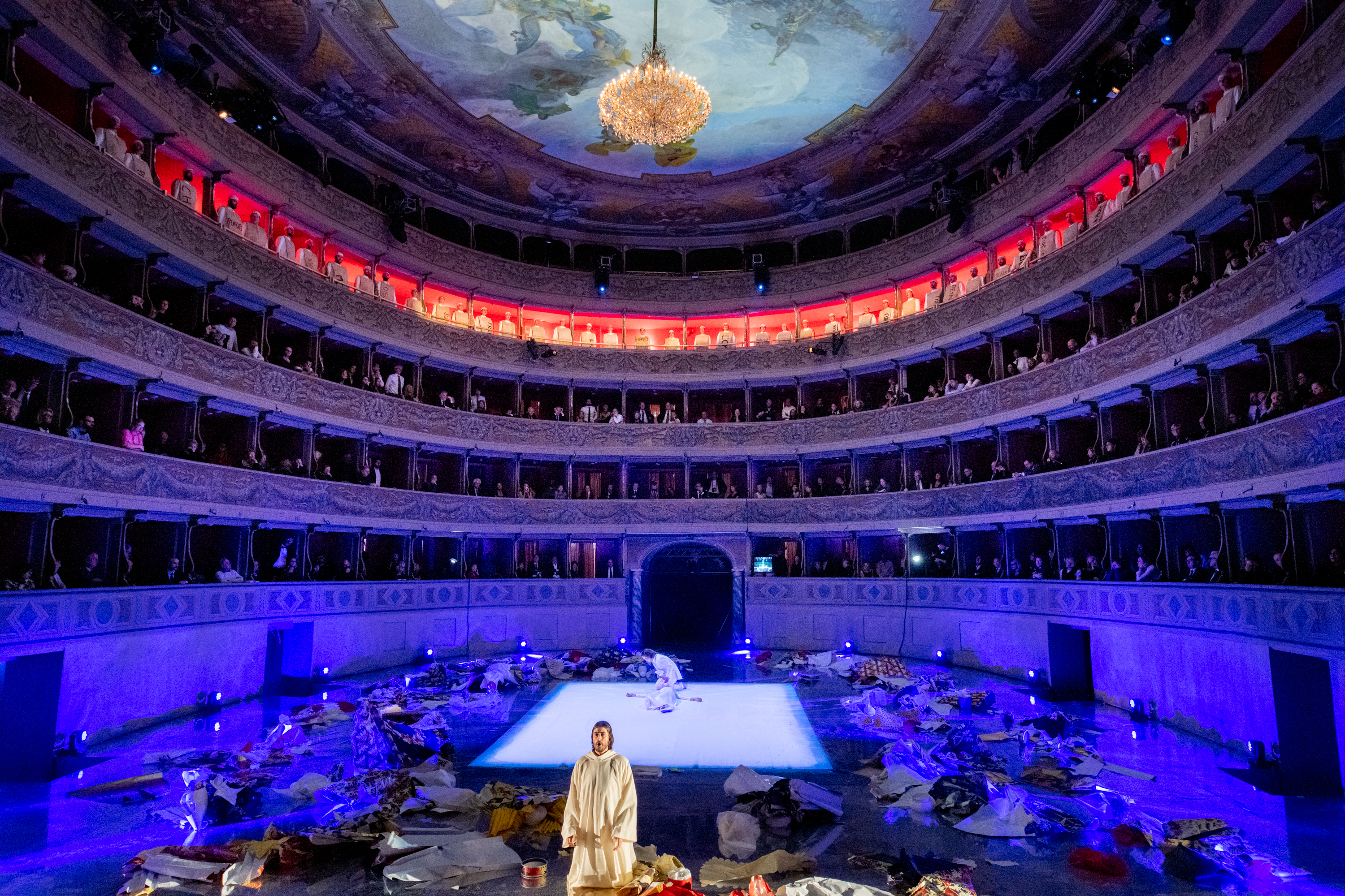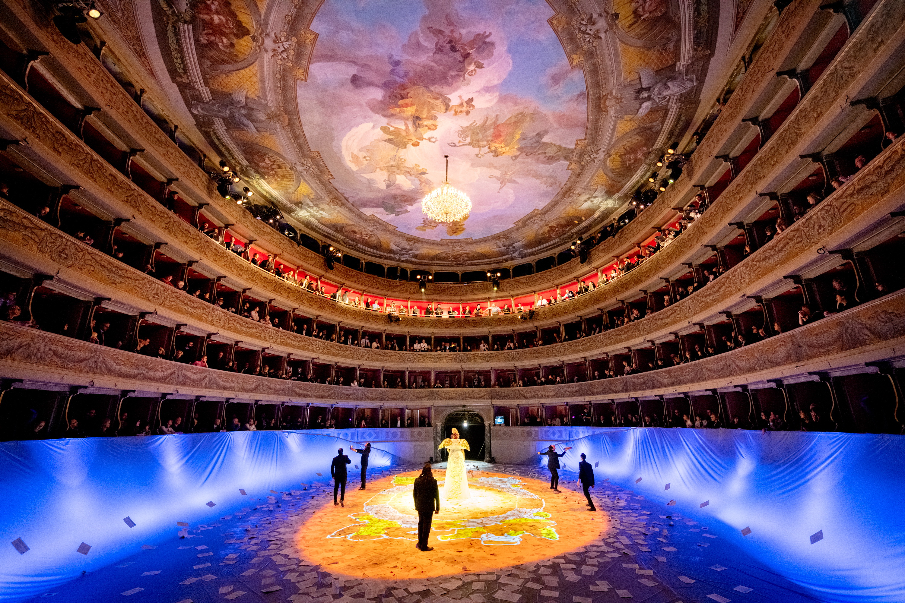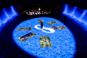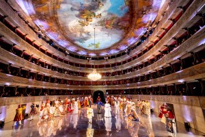 In order to accommodate the action in the round, Micheli uses the space quite skilfully. Rather than sets, he uses projections of a variety of imagery – images of Nisida, coats of arms, as well as musical sketches, the score literally coming to life before us. For the first half of the evening, the floor was covered with sheets of paper as if, again, allowing the fragments of the work to come to life. Micheli uses his singers to provide constantly changing stage pictures – whether placing the chorus in the balcony, the people separated from the courtly action, or by using them as dancers within the arena in the second half of the evening, setting up a vivid impression of courtly life.