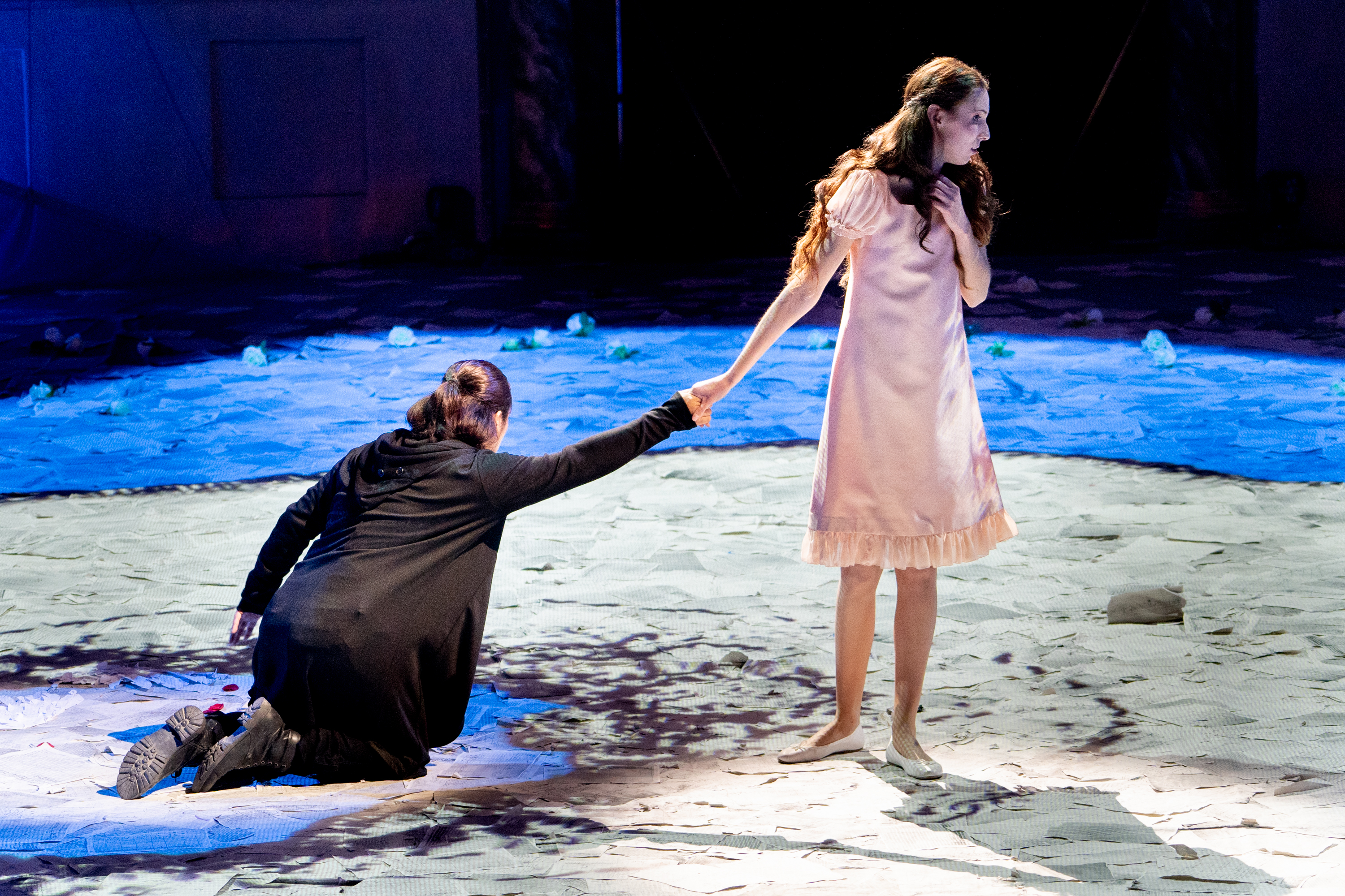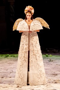 Micheli also highlights Sylvia’s plight most sensitively, in turn allowing the audience to reflect on the plight of those women who have no choice but to give their bodies to powerful men. In a striking scene in Act 2, Sylvia is raised on a pedestal and praised by the crowd. Yet, the scene is interrupted by the entry of the Monk who humiliates her, in an instant going from praised to scorned, debased and belittled in front of others. This was an exceptionally powerful image and all of a piece with Micheli’s willingness to understand and tell Sylvia’s story.