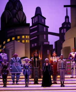 Doucet and Barbe give us a futuristic yet cartoon-like setting. This is a show that provides pure escapism – an ideal seasonal treat – and it was extremely well received by the Hamburg public who rewarded it with frequent applause and hearty laughter. Don Magnifico’s household is a bank, with Angelina, simply dressed, dealing with the menial tasks of processing paperwork, as well as cleaning and cooking. Don Ramiro is perhaps a film star – his castle is called ‘Studio City’ – and this idea of Angelina’s dreams coming true and finding romance with a photogenic movie star is one that I found most convincing. This revival had clearly been well-rehearsed by Holger Liebig. The intricate movements of the cast around the stage during the Act 1 finale were executed with confidence. Costumes (Barbe) were opulent, the gentlemen wearing what appeared to be antennae on their heads, as well as space suits, the sisters some quite extravagant wigs, and Angelina herself a striking diamante number for the ball. A troupe of robot-like figures on wheels performed a ballet just before the Act 2 finale and this was equally greeted by warm applause. All credit also to Anduaga for continuing with his big number after the chorus members crashed his vehicle into the set as they wheeled it on from the wings – to the audible amusement of the audience.