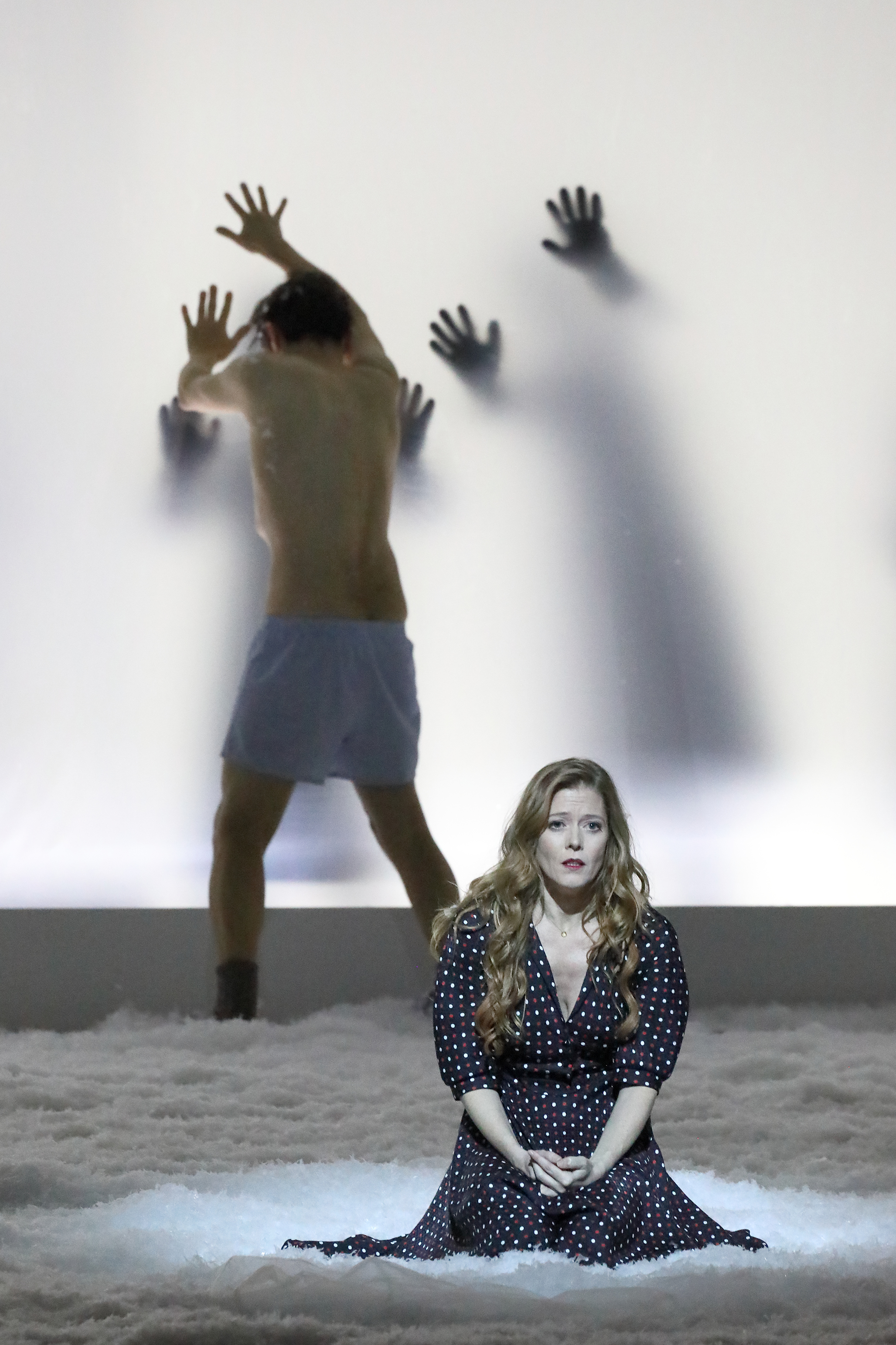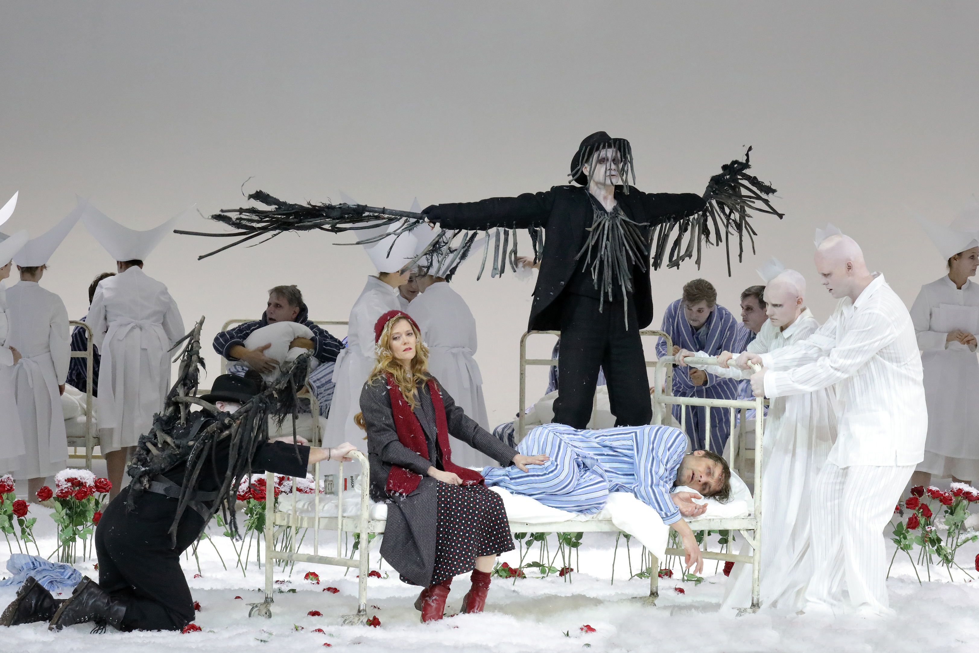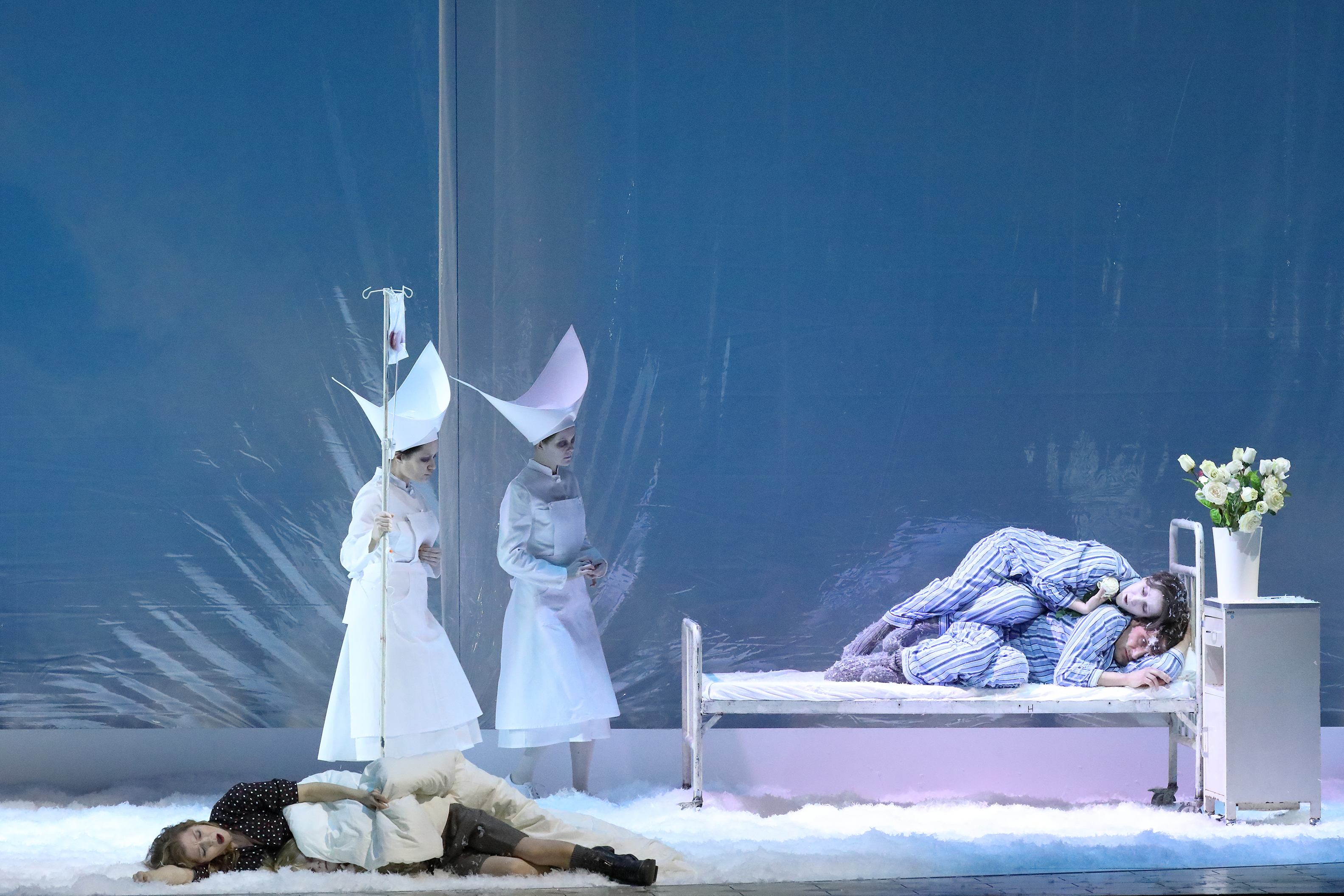 The work is inspired by Hans Christian Andersen’s eponymous fairy tale. It takes the personal relationship between Gerda and Kay and develops it into a tale of Gerda’s desperate quest to regain her one true love, who is apparently suffering from mutism after undergoing a trauma. That what precisely that trauma was, is not immediately apparent. Kriegenburg gives us a staging that is very much a meditation on memory, one that transcends time with multiple versions of Gerda and Kay, whether as children, teenagers or adults on stage, at any one time, or simultaneously. The adult Kay is played by an actor, Thomas Gräßle. The presence of nurses and other patients on stage, suggests that Kay’s trauma is not unique.