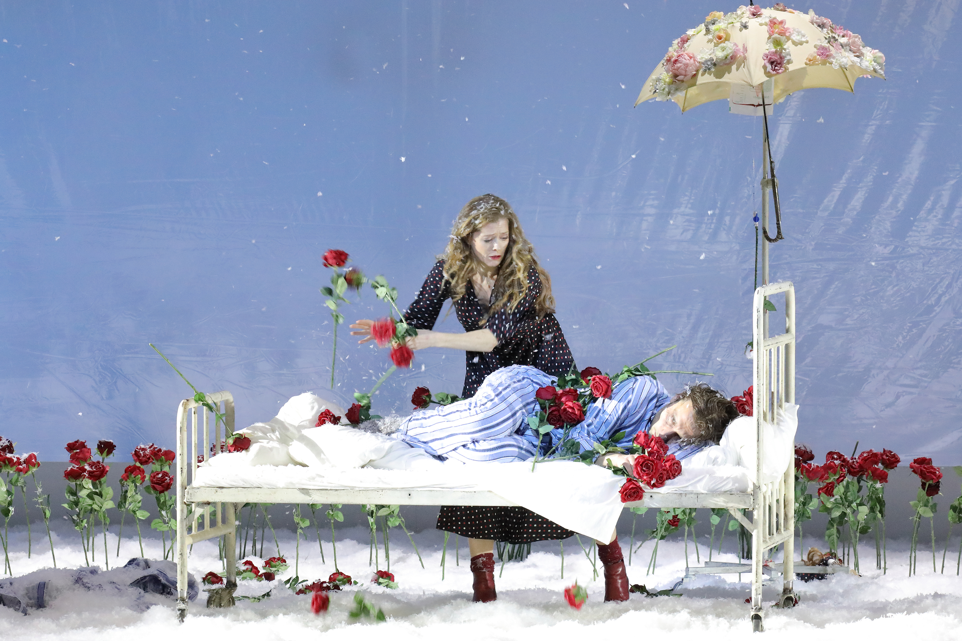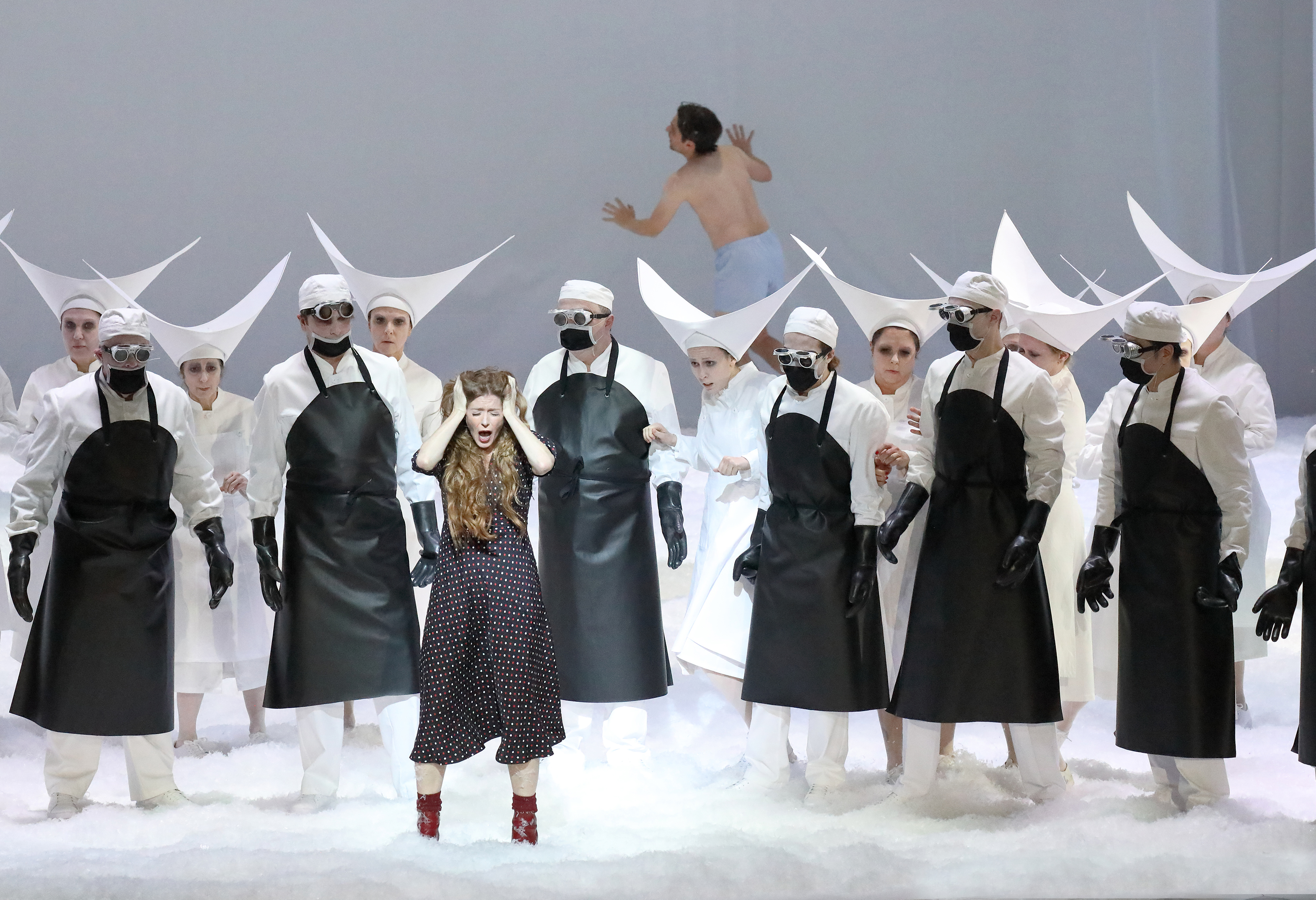 This is very much an adult version of the Snow Queen tale, especially as the Snow Queen herself is played by a bass who here is very much a man – even if the libretto refers to her using female pronouns. Kriegenburg gives us a world that is rather dark – the Snow Queen asking Kay to come and kiss her and be protected inside her coat, Gerda given space to sleep in the Prince’s bed, or Gerda kissing passionately the reindeer, performed by the same singer who sings the Snow Queen, all point to something very dark – an undercurrent of abuse that hides below the pristine whiteness of the stage pictures. It’s presented dispassionately, in a way that provokes reflection, and suggests that even within the most innocent tales, there’s a darkness to the human spirit that’s inescapable.