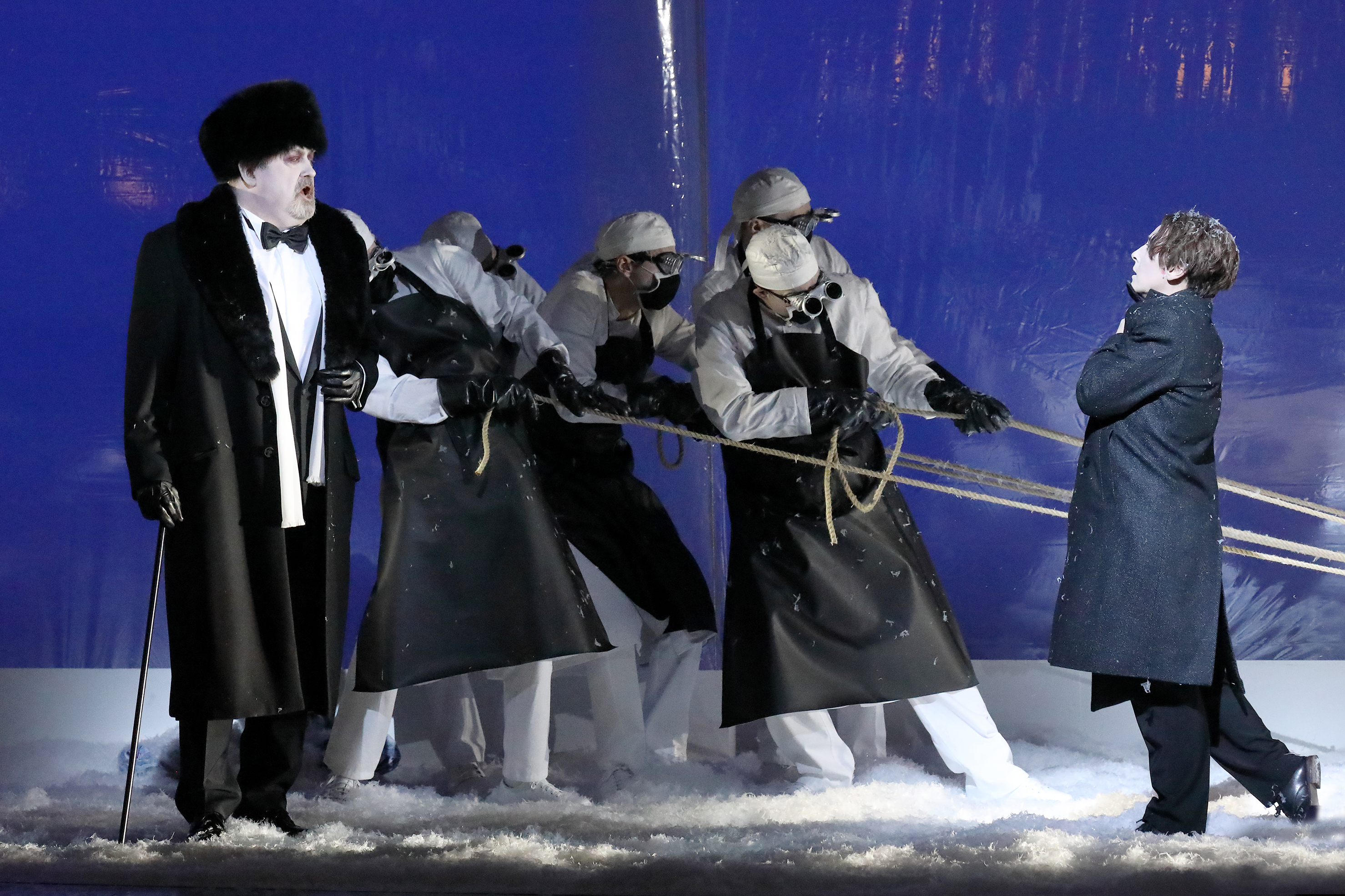 Around this, for his first opera, Abrahamsen has given us a score that very much lives in its own sound world. He uses an extremely large orchestra, but the forces are used to provide a wealth of instrumental colour, rather than creating volume. Indeed, the vocal lines are allowed to emerge over the textures, especially in the grateful acoustic of the Nationaltheater, and are also generally quite singable, revolving around a relatively narrow vocal compass. The exceptions are for Gerda and the Princess, both written in quite an angular way, with both given some extreme leaps into the stratosphere. Some of the word setting for Gerda is redolent of the Rake’s Progress, the closing ensemble seemed to hark back to the closing moments of the Britten War Requiem. Abrahamsen gives us a score of extreme rhythmic complexity, providing layers of delicate, constantly repeating, yet shifting rhythmic patterns. The sound world is as fragile as the many snowflakes descending onto the stage – whether in the use of extremely high string harmonics, gargling winds, or threatening brass interjections at the bottom of their range, setting that atmosphere of danger below the surface. The work unfolds at a natural pace – perhaps the final scene drags slightly – but otherwise it didn’t seem to outstay its welcome over the two-hour-twenty-minute running time, including intermission.