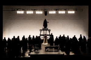 Direction of the singers was also perfunctory, with much standing in rows at the front with arms outstretched, singing to the audience, even when addressing other characters. I longed for characters to actually engage with each other – as Stuarda went for Elisabetta with her celebrated denunciation, there was a distinct lack of dramatic electricity, Stuarda addressing this to the audience rather than staring directly into Elisabetta’s eyes as she called her a ‘vil bastarda’. Still, there were some interesting visual touches. De Rosa set the opening of Act 2 with only a chair and a candle as a set, which could have been even more striking had the personenregie been stronger. Similarly, as Stuarda was taken to the gallows, a hooded executioner towered over the chorus arranged in rows, the axe looming over the imminent beheading. Again, I’m sure there are some who might appreciate this approach. It sanitizes this gruesome story and makes it more about attractive dresses and emoting to the audience. Yet, I longed for something that pushed the singers to create drama, to bring out the passion, and to mine the deep range of emotions inherent in the work.