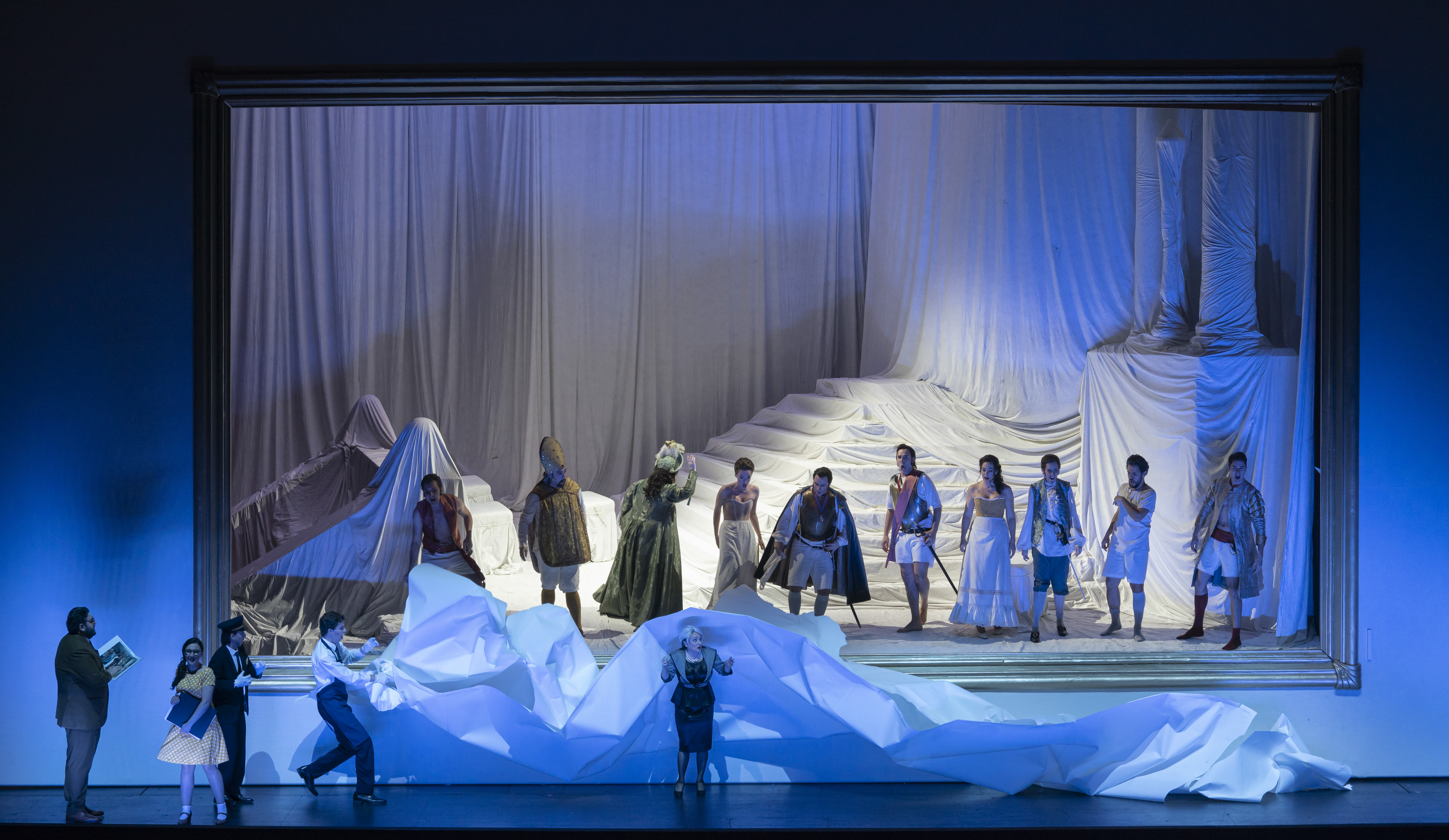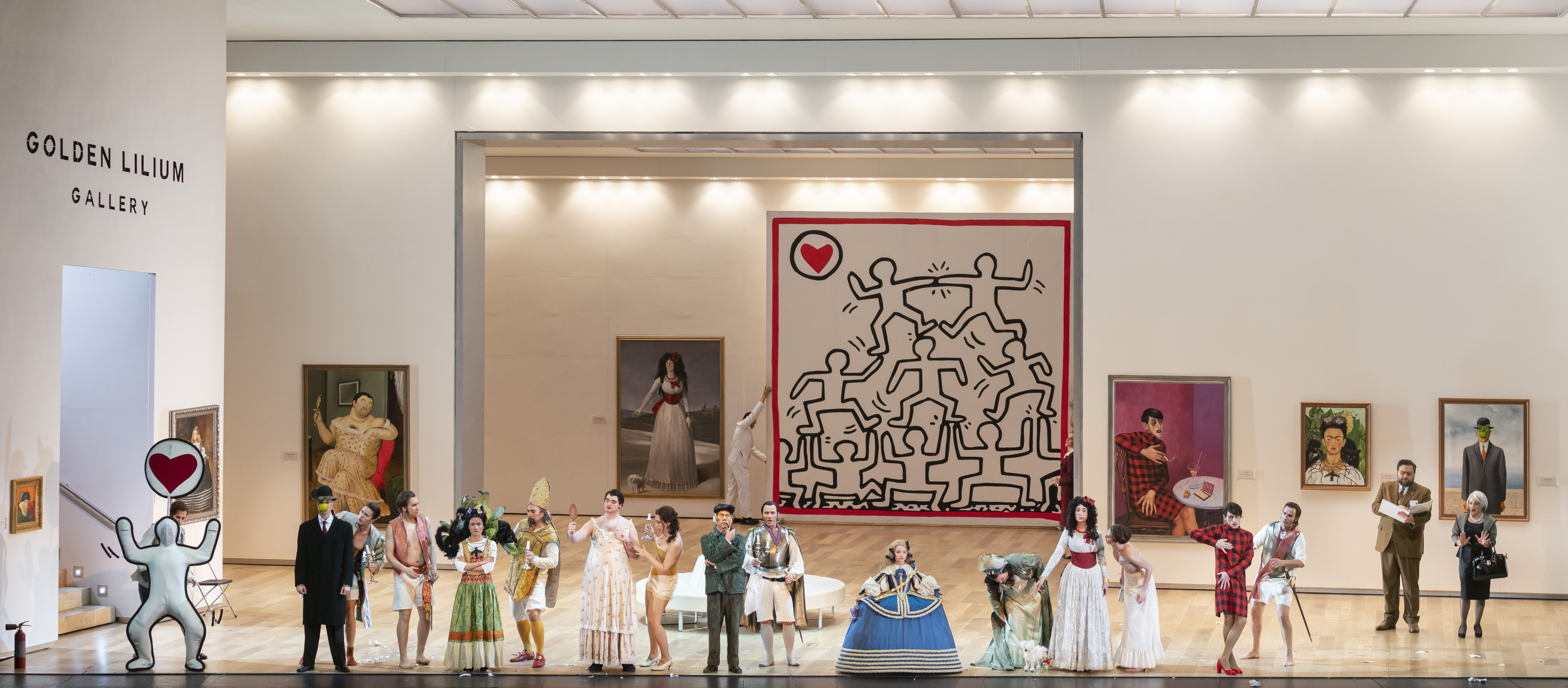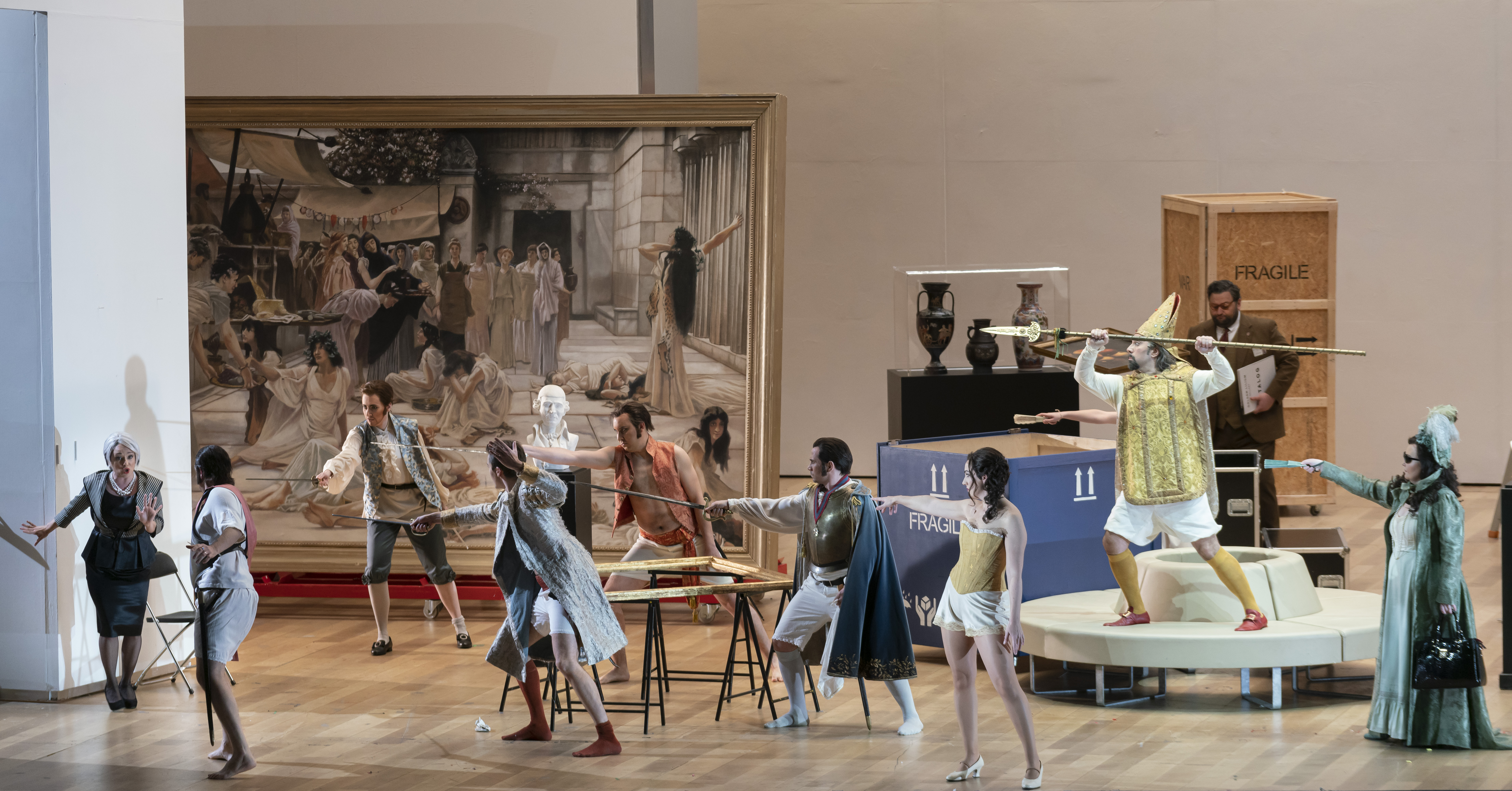 Michieletto’s staging is well travelled, having also been seen in Amsterdam and Australia. I saw it in 2017 in Copenhagen, where I thought it a brilliantly inspired piece of theatre – an impression reinforced tonight. Rather than setting the work in an inn, Michieletto sets it in an art gallery, the Golden Lilium Gallery, where the staff, overseen by Madama Cortese, are setting up a vernissage. As the evening unfolds, artworks come to life, characters emerge from boxes and take form right in front of our eyes. There was something exhilarating in hearing the audience react with glee to seeing famous artworks coming to life – the familiarity bringing a sense of participation, of living a shared experience.