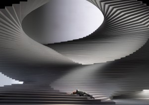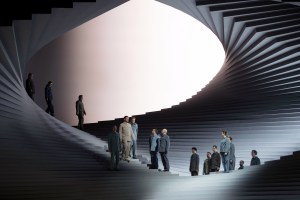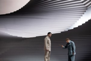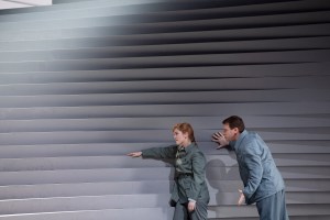 I start with these thoughts because it struck me that the set for Christoph Waltz’s Fidelio at the Theater an der Wien, by architectural bureau Barkow-Leibinger, must have been a staggering sight in the house. The set consists of a huge structure, taking over the height of the entire proscenium, consisting of stairways inverting themselves as the set rises, with characters descending from the middle of the structure to the foot, where the action takes place. The exception to this was the prisoners’ chorus where the prisoners were brought up from below. A large circle above suggests a way for characters to enter, as well as providing a sight of freedom beyond, but nobody seems able to reach it. Felix Breisach and his team do a good job of capturing the visuals and their impact, the camera work feeling natural, and fortunately without extraneous shots of the pit bringing us out of the narrative.