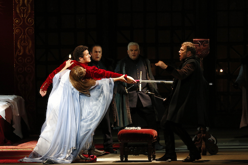 Mielitz’s staging now seems like something from a distant age. It’s certainly colourful, with medieval chic meets Prussian military costumes for the extensive forces, and the chorus and extras marched on and off holding imposing banners. There are hints of the tension between the pagan and Christian in the imposing ceremonies of Act 2. At the same time, it all feels somewhat clichéd, with Elsa making her entry in a white dress, supposedly symbolizing innocence, while Ortrud, with her red velvet costume and flaming red hair, seemed to point to hackneyed visions of witchcraft. Given Lohengrin was dressed in a red shirt, it did lead me to wonder if there was something in that. He made his entrance on a rather imposing mechanical swan, pushed on from the rear of the stage. Personenregie was perfunctory – some singers coped better than others. There were a lot of outstretched arms to the front, and direction of the chorus seemed to be more about traffic management than actually creating a mob of living, breathing individuals. That said, the scene at the start of Act 2, between Tomasz Konieczny’s Telramund and Evelyn Herlizius’s Ortrud, was utterly electric, both bringing out utterly cogent and compelling characters through their use of text and sheer physical presence, perceptible even through the small screen. Indeed, what the small screen amplifies is the sheer depth of facial expressions available to both of these great singing-actors, Herlitzius especially, in Act 1 seemingly holding the stage even with hardly anything to sing.