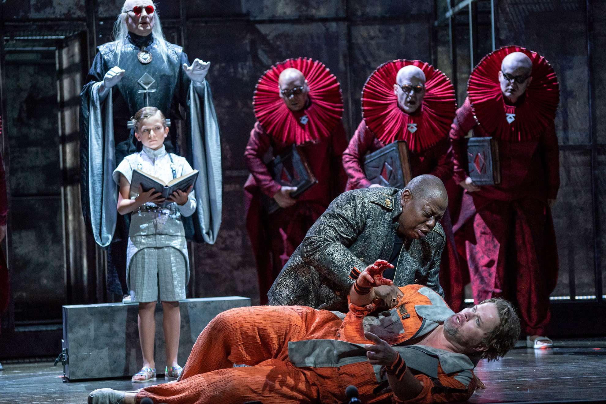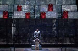 Heliane contains some of that gloriously soupy music familiar to lovers of Korngold. The story of the sexual awakening of the wife of a totalitarian ruler, her sexuality roused by a mysterious stranger, the demands on the three principals are considerable. There’s also some rousing choral writing in Act 3. Räth sets the work in a relatively simple set, a place prison officers walk in formation and the Ruler, judges and their entourage dress in costumes featuring a logo that appears constantly around the set. The costumes (Esther Bialas, who also designed the sets) seem quite futuristic for the ruler’s entourage, while the people appear to be split between the men dressed as Scandinavian fishermen and the ladies as Russian babushkas, thereby reinforcing the element of timelessness. This futuristic world was also apparent in the opening scene with the Stranger brought in on a cart, in an orange jumpsuit, and his head covered with a cloth bag. The presence of a corps of dancers add visual interest, whether in their dancing with portraits in Act 2, or dancing with Heliane at the opening of Act 3, with full credit to Stundytė for dispatching the complex choreography with the dancers.