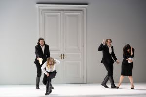 Così is a work rooted in humanity, in what makes us as humans imperfect, but also in our need to love and feel love, our notions of loyalty and jealousy. In this it takes us to the core of what it means to feel and have feelings. Loy’s staging is set in an austere visual setting – a simple plain white set where the action takes place, except for a brief opening up in the second act to reveal a garden behind. This notion of complicated humanity, of the fact that our actions aren’t always logical but founded in an emotional need for something, be it validation, or to feel better by shaming others, sits at the heart of Loy’s staging. He gives us an interesting premise – the lovers don’t come back in disguise but are clearly the same people as before, just slightly differently costumed. As Fiordiligi and Dorabella start to give in, much is communicated by a glance to their actual lovers, as if to acknowledge their full complicity in what they’re doing. Similarly, so much is communicated by Johannes Martin Kränzle’s Don Alfonso, brought out fully over the small screen by Michael Beyer’s sensitive camerawork. This is a Don Alfonso who clearly regrets what he’s done from the very start, yet still seems to get a kick out of it. It made for a fascinating reading of the work, one that felt fresh and unfamiliar, and despite the familiar plot, challenged it and questioned it as well as our preconceptions, giving us a story of four central personalities who can never be the same again.