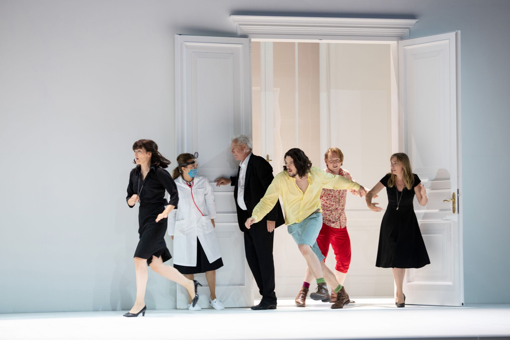 Così is a work rooted in humanity, in what makes us as humans imperfect, but also in our need to love and feel love, our notions of loyalty and jealousy. In this it takes us to the core of what it means to feel and have feelings. Loy’s staging is set in an austere visual setting – a simple plain white set where the action takes place, except for a brief opening up in the second act to reveal a garden behind. This notion of complicated humanity, of the fact that our actions aren’t always logical but founded in an emotional need for something, be it validation, or to feel better by shaming others, sits at the heart of Loy’s staging. He gives us an interesting premise – the lovers don’t come back in disguise but are clearly the same people as before, just slightly differently costumed. As Fiordiligi and Dorabella start to give in, much is communicated by a glance to their actual lovers, as if to acknowledge their full complicity in what they’re doing. Similarly, so much is communicated by Johannes Martin Kränzle’s Don Alfonso, brought out fully over the small screen by Michael Beyer’s sensitive camerawork. This is a Don Alfonso who clearly regrets what he’s done from the very start, yet still seems to get a kick out of it. It made for a fascinating reading of the work, one that felt fresh and unfamiliar, and despite the familiar plot, challenged it and questioned it as well as our preconceptions, giving us a story of four central personalities who can never be the same again.