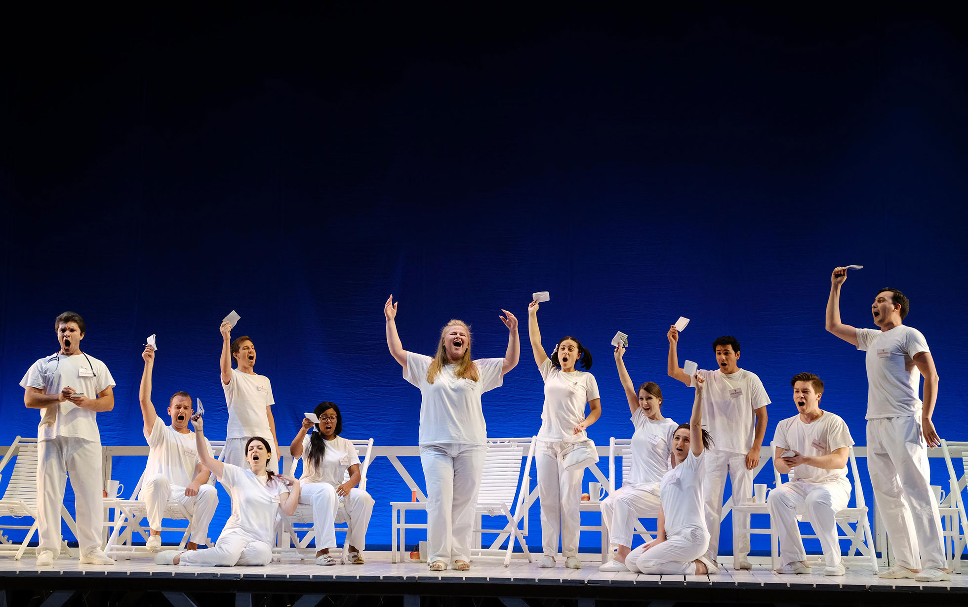 The sight of both the Italian and European Union flags on either side of the stage, served as a reminder of how this work celebrates the peoples of Europe coming together. In a time where the United Kingdom is faced with a far-right government thriving on encouraging hate and prejudice, this message of celebrating both national differences and the joy of working together with others, could not be more welcome. Sagi’s staging, here revived by Elisabetta Courir, is by now a well-known quantity. I saw it, and discussed it at length, back in 2017 at the Liceu. Set in what appears to be a beach-side sanatorium, it provides an appropriate framework for the action. What was notable tonight, magnified by the screens giving us even more detail of what unfolded on stage, was the clear delight in the cast being able to perform for us – their facial reactions gave us a sense of a group of characters clearly engaging with each other. Of course, Sagi’s staging doesn’t come anywhere close to giving us the life-enhancing joy that Michieletto’s does (one of the greatest stagings of anything I’ve seen). I’m also not quite convinced Sagi creates a clear, coherent narrative from the work – it feels more like a sense of scenes in succession. But, as a framework to allow the performances to come to life, it does the job.