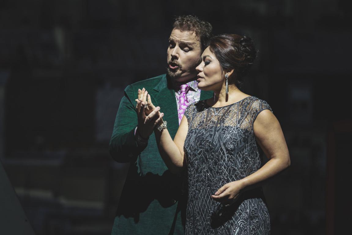 In a note in the program book, Krief explained how he had adapted his staging to the current sanitary situation. Other than the fact that the principals and chorus wore plastic visors in Act 2, it actually felt, having not seen the original run, that we were seeing a perfectly conventional night at the opera. Krief described how the singers were unable to kiss or get too intimate with each other, but it’s testament to his vivid direction, and the strong performances of the cast, that one didn’t notice any lack of intimacy, rather there was absolutely a sense of that blooming love between two people, particularly in Act 2.