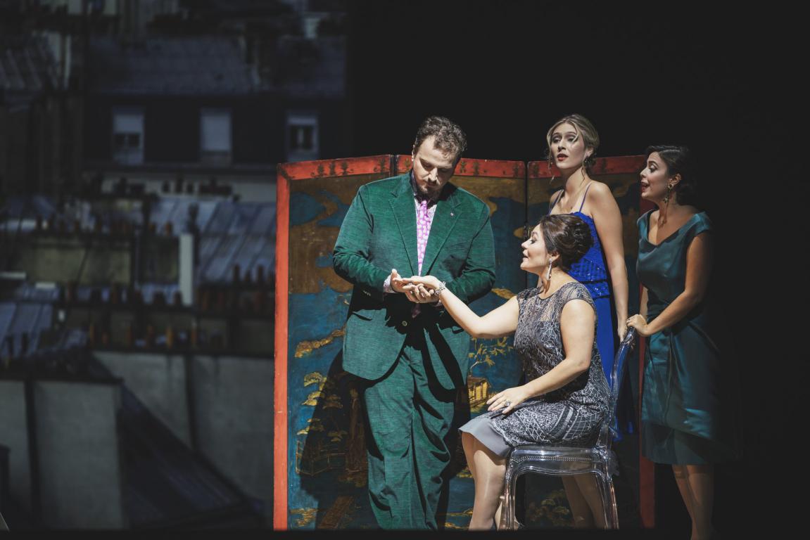 Her Ruggero was sung by Dmytro Popov. Popov ideally incarnated the provincial youth in the big city, both in the relative stiffness of his acting at the start of Act 2, but also through his vocalism – there was a slightly stentorian manner to his singing at first that felt exactly right. As the act progressed, he found a warmth in the tone, pouring out clarion sound on high. Again, in Act 3 he lovingly phrased his music so that when the end came, it had even more impact. As Lisette, Roberta Mameli offered a bright crystalline soprano with an easy top. Francesco Castoro sang Prunier with a bright, well-focused tenor, while Francesco Verna was an appropriately gruff Rambaldo. All the remaining roles were cast with strength with a special mention for Elena Bazzo’s eloquent singing of the off-stage solo at the end of Act 2.