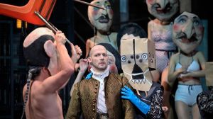 The production was confided to Jeanne Candel – although interestingly the program book, published on the Opéra Comique’s website, has Candel responsible for the mise-en-scène, but Lionel Gonzalez responsible for ‘dramaturgie et direction d’acteurs’. They give us a visually sumptuous staging, one that feels in many respects unobtrusive. It allows the narrative to flow easily and logically and the characters to give believable and cogent performances. There’s a lot to look at – an initial white curtain at the start of Act 1 is shot at by the chorus, with the bullets seemingly producing a variety of colours. This is removed to display an impressive set (Lisa Navarro), a central elevator through which characters make entrances and exits, surrounded by stairs that at one point seemingly bleed with red paint. Candel keeps the singers of the Pygmalion chorus busy, whether costumed as cleaning ladies, or perambulating the set with dog heads, or wearing swim suits wearing giant cartoon heads. Costumes for the principals appear to be antique chic, but the remainder of the cast wears modern dress. Similarly, the evening ends not with the chorus ‘que tout soit heureux’, but with Lea Desandre’s Bergère singing her ‘rossignols amoureux’ in modern dress while carrying a backpack and pushing a bicycle. It could have been that Candel was making the point of the fact that the story between Hippolyte, Aricie, Phèdre and Thésée was one of antiquity with contemporary resonance, but I’m not quite sure. Given the clarity of the storytelling and the competent direction of the principles, it just felt unnecessarily confused.