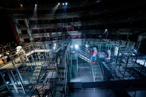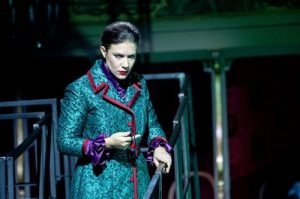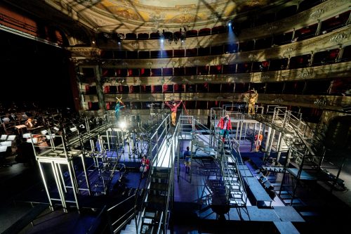 The staging at the Festival was entrusted to Stefano Ricci. In order to respect the current sanitary situation, the action took place on a metallic structure made up of interlocking stairways taking up the platea, while the orchestra was situated where the pit usually is, and the chorus sang in rows on stage. Monitors around the stage area allowed the singers to see Riccardo Frizza conducting. A group of ‘performers’ added additional visual interest, as they seemingly impersonated conspirators, and in Act 3 were seen controlling the movements of the principals as if marionettes. As Elena sang her big number ‘Dio clemente, ah mi perdona’, we could see the deceased Fernando being manipulated by the performers. During the chorus ‘Lode a Leoni’, the chorus gyrated around the stairs for seemingly no more apparent reason than to give something to look at, given the chorus was singing from the other side of the room. In the ball that closed Act 1, the ‘performers’ perambulated around the set in quite elaborate headwear, before seemingly having epileptic fits in the closing pages of the Act. Arnalda Canali did well to capture it so efficiently for the small screen, but it was all extremely busy. I did wonder if less would indeed have been more in this case. It was certainly entertaining, it not a bit de trop.