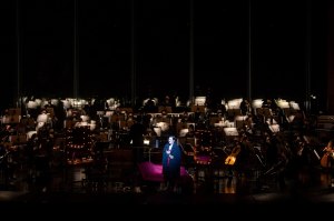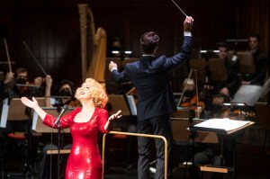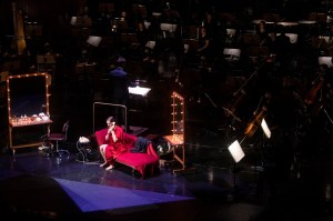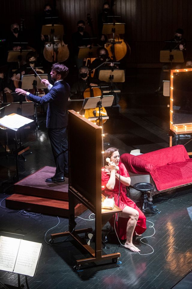 This was something of a family affair at the Fundação Gulbenkian, with the orchestra’s music director, Lorenzo Viotti, joined by his sister, noted mezzo-soprano, Marina. The program was entitled La voix humaine and we did indeed get Poulenc’s melodrama. To make an evening of it, the Poulenc was made into the centrepiece of a woman’s journey from chanteuse, to dejected lover, to resolution, in quite an ingenious way. Costumed in a striking red dress (couture by Julien Fournié) accessorized with a blonde wig, Viotti sœur sang three classic French standards, before launching into the Poulenc. Together with director Vincent Huguet, the Viottis gave us a fully thought-out concept, taking us on a journey from the highlight of an evening at a Pigalle cabaret, to a woman’s desperation in her loge, to a final resolution that felt unbearably moving.