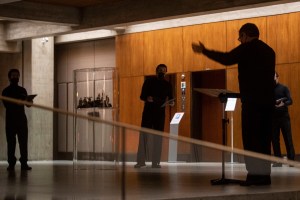 Or perhaps there was, because in the lobby the Coro Gulbenkian sang Poulenc’s setting of the Salve regina. In the hall, with the doors to the lobby open allowing the sound to flow in, the effect must have been magical – the sound of gentle consolation emerging from and into nothingness. Conducted by Jorge Matta, the chorus sang with superb discipline and tuning, the blend was excellent, yet with the sopranos adding the fizz of a natural vibrato to the crystalline textures, almost like a fine vinho verde. With Elle spotlit alone on stage in the darkness, the Salve regina brought us back to some resolution in the most sombre of places.