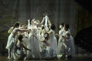 De Beer sets the work in around the time of its composition.  We see the Egyptians as a society that stores the plunder of their colonial adventures in a museum – the Act 1 ceremony to Phtà appears to be taking place at a vernissage of the latest loot.  De Beer stages the triumphal scene with the chorus in black costumes standing to the left and right of a central stage, where the ballet recreates scenes of war and colonization.  It all feels rather heavy handed, with a focus on the ceremonial that, although this is a work with big choral scenes, it’s also one that focuses on the conflicts between individuals – the forbidden love, the jealous powerful woman, or the conflict between duty and love.  Instead, de Beer gives us something that never seems to want to bring us in, to understand characters’ motivations, to ask questions of ourselves and our roles in perpetuating colonial stereotypes.  Rather, this is a highly visual staging that keeps us at an arm’s length and remains emotionally cold.