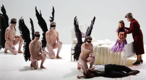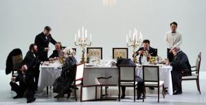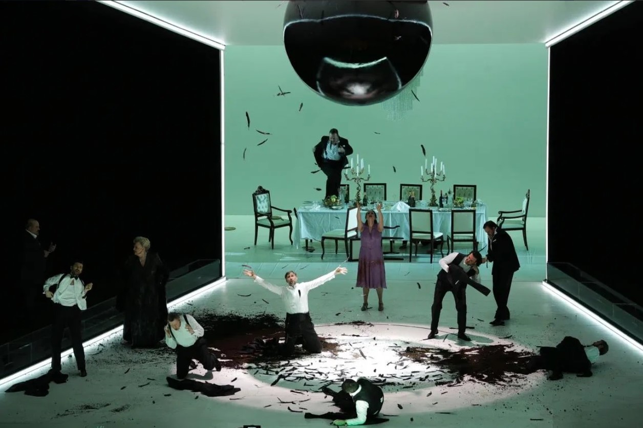 I found Michieletto’s quite dispassionate and ambiguous treatment of the narrative to be utterly compelling. Particularly so as Salome lusted after a Jochanaan who may have had more in common with her father than might first appear. Michieletto had Wolfgang Koch’s Jochanaan damning Salome while standing atop a plinth with the name Herodes Philippus on it. By setting out this darkness that lies below the surface of family life, the demons within, Michieletto makes us question what would help us to cope with horrors at home. Would it be religious imagery: the dead lamb, the cup of blood, or the head of Jochanaan looking as it had been brought straight over from one of the local catholic churches? Or would it be the winged angels, portending a different place, perhaps imminent death. He achieves this through some stunning stage pictures – including during the dance as Salome loses herself in a dress that appears to be dripping fabric streams of blood. So much is intimated, so much is suggested. Michieletto makes us think and makes each audience member find their own reading in what they see. This is highly intelligent music theatre.