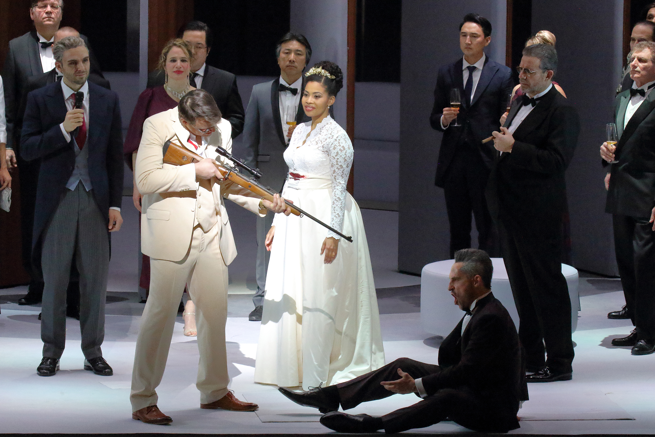 Similarly, with Golda Schultz’s Agathe, the character felt rather cold, with Schultz pensively walking around the stage, singing her numbers to the side, without a sense that she was fully engaged in them. Again, this is no reflection on Schultz’s performance, but rather that as directed, her character felt disconnected from what was happening around her. An impression heightened by the fact that much of the dialogue between Agathe and Ännchen happened in the surtitles, as if they were texting each other in the same room. Schultz did, however, sing her music exquisitely. I did wonder if the voice is rather small for the role, but her peaches and cream soprano, with its creamy core and effervescent vibrato, gives an enormous amount of pleasure. It sounded that she might have appreciated ‘Leise, leise’ a notch or two faster, the breath not quite optimally sustained, but she sang ‘Und ob die Wolke sie verhülle’ with wonderful poise.