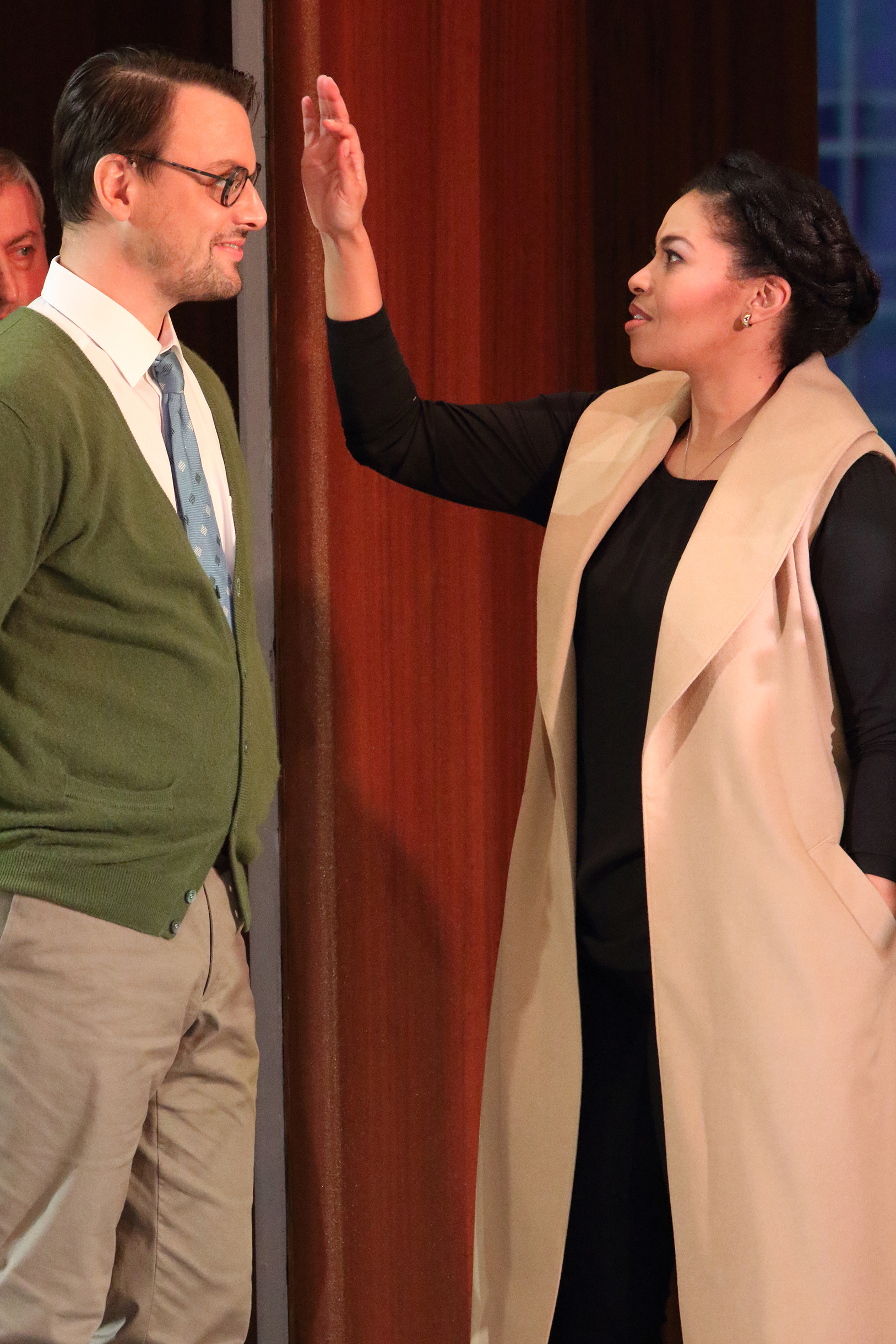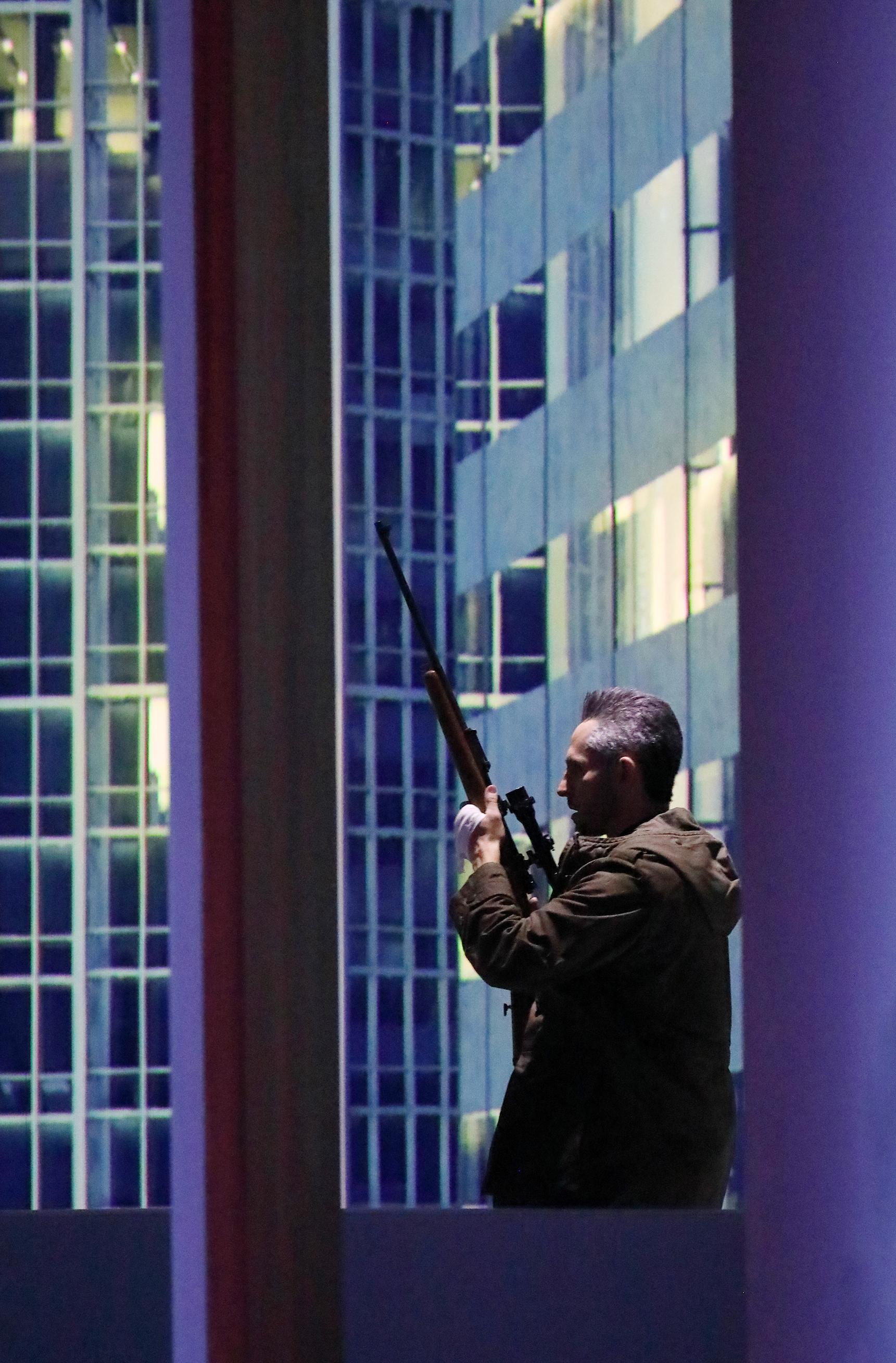 In common with his Zurich Makropulous Case, Tcherniakov uses the prologue to illustrate the character’s backstories – here projecting their faces above the stage, accompanied with brief biographies. Kuno is a corporate boss, Max an eager employee who wants to do well, and Agathe Kuno’s daughter who has set herself up on her own. Kaspar is a colleague who, thanks to previous military service, is psychologically unstable and appears to have multiple personality disorder, while Ännchen parades around the stage in sapphic chic and clearly carries a torch for Agathe, which renders her ode to men somewhat superfluous. Within the single set, also designed by Tcherniakov, the action opens during an alcohol-fuelled corporate celebration, with Max being forced to take a shot, using a rifle, at a passing pedestrian outside. When he refuses, Kilian takes it instead, apparently killing the pedestrian. This sets in train a series of events that plot Max’s disintegration, whether in his after-hours encounter in being taunted by Kaspar/Samiel, or his drunken appearance at his own wedding that seals his fate.