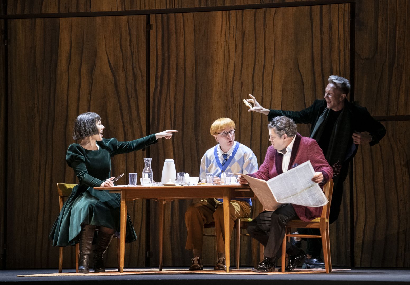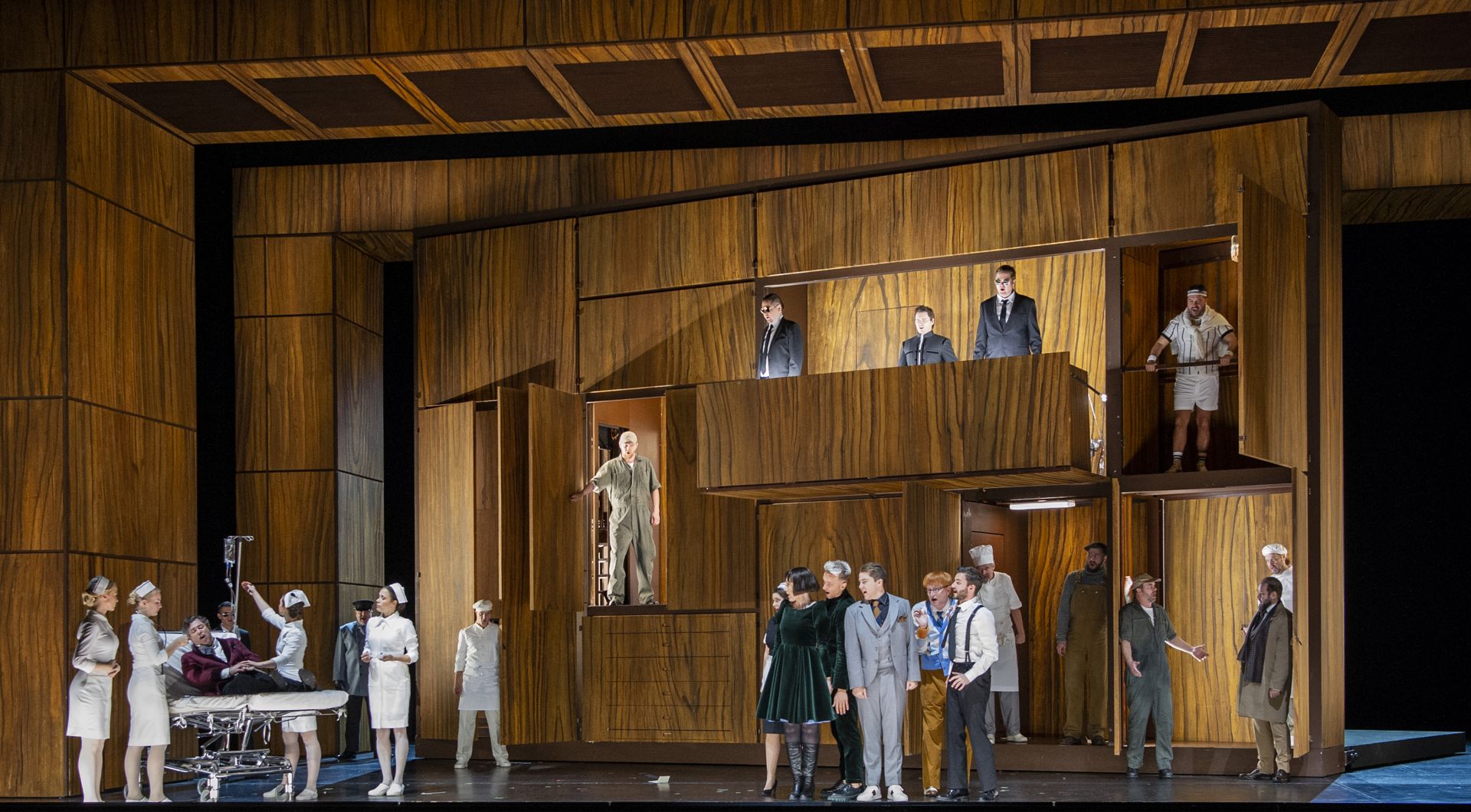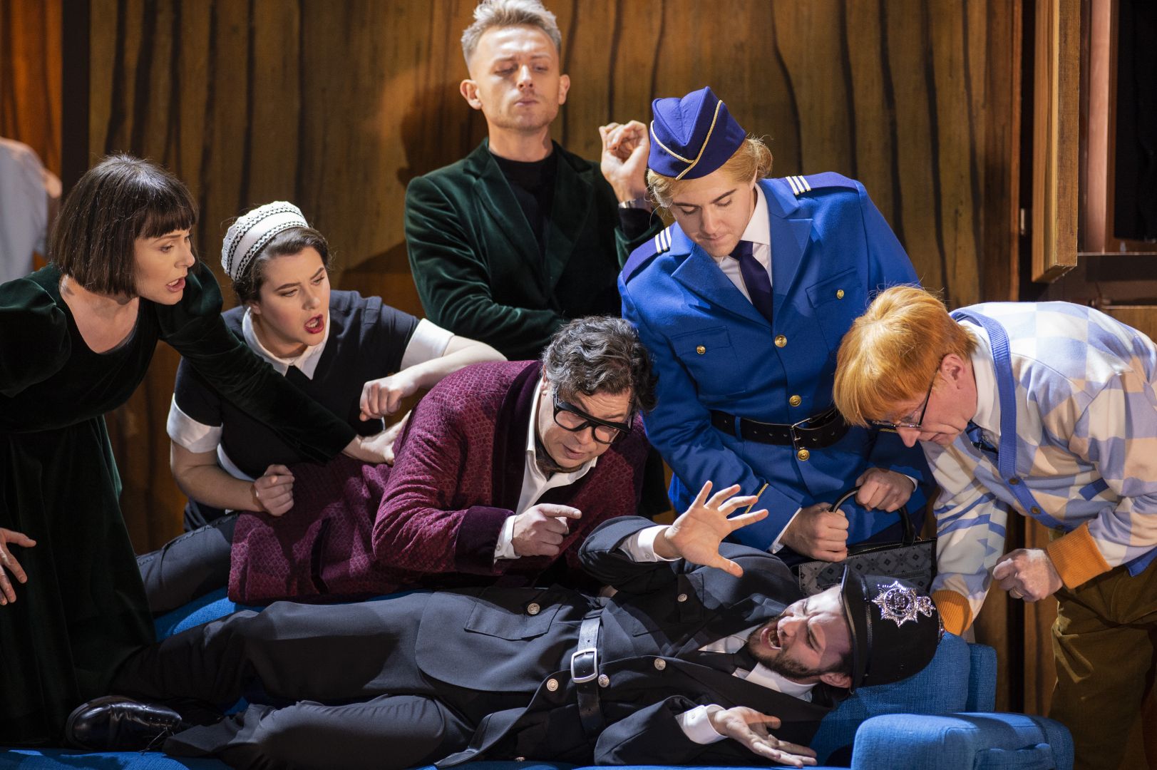 Mijnssen sets the action with a striking wooden set (Hubert Murauer) that resembles an extension of the beautiful wooden interior of the emblematic Oslo house. A large wooden structure, containing multiple doors, was carried on a revolving platform that allowed the audience at home to view the action from multiple angles, including a staircase in the middle. It also showed characters or chorus members appearing when the doors opened, or indeed Hubert Zapiór’s Figaro throwing crumbs of bread on the floor to distract Basilio while he ate breakfast. There were certainly hints that Jack Swanson’s Almaviva was more of a blatant womanizer than he can often seem – his obvious flirtation with the ladies of the band in the opening scene, suggested that Rosina may be one of many, portending the events of Le nozze di Figaro in fact. That said, his affection for Rosina was utterly believable and genuine – two people very much into each other. Although his flirtation with the dancing waitresses in his big closing number suggested trouble ahead.
