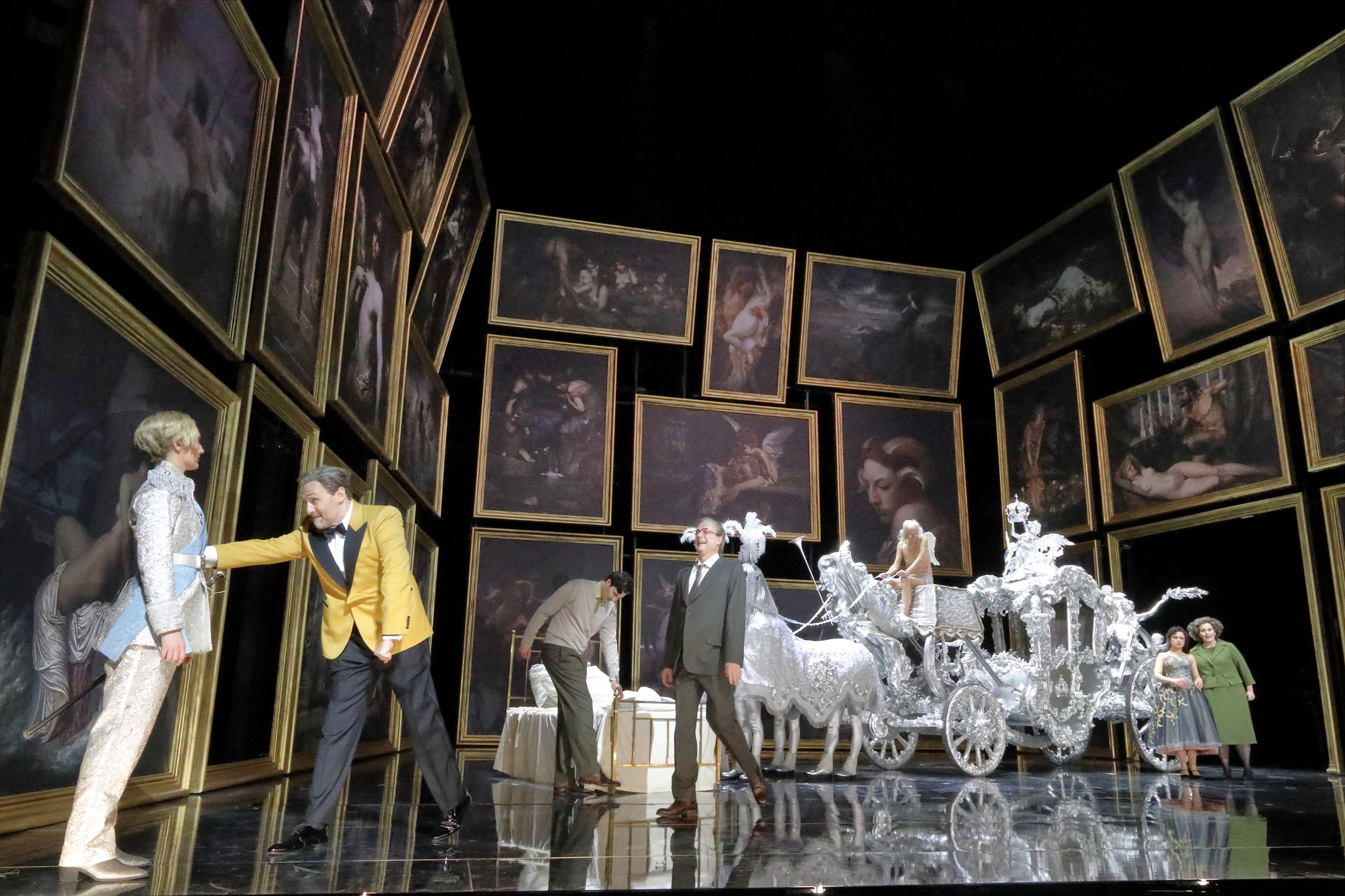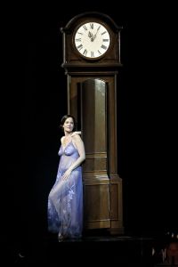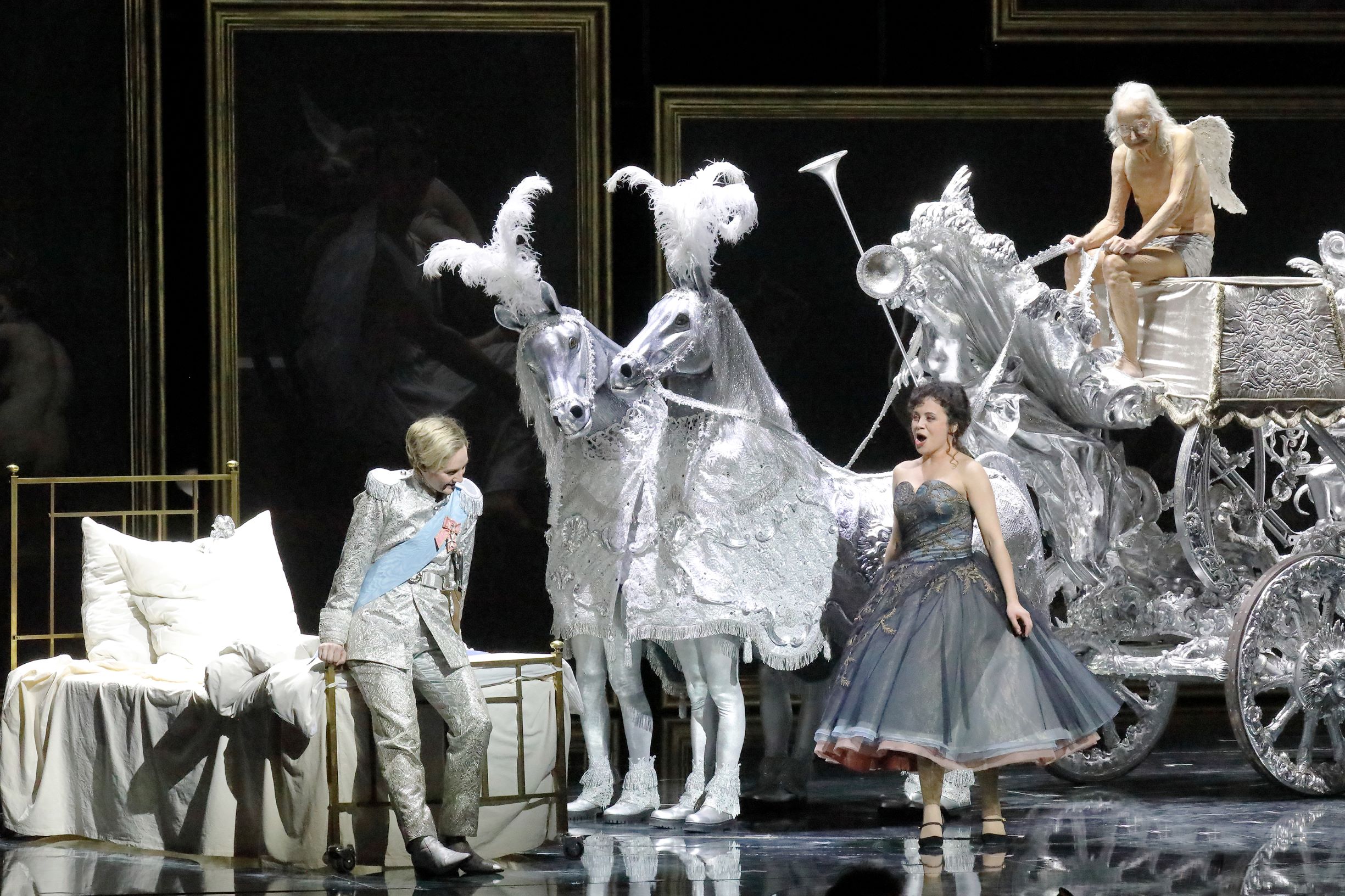 The first impression of this Rosenkavalier is that it looks like absolutely no expense has been spared in the set or costume designs (Rufus Didwiszus and Victoria Behr, respectively). Octavian and his entourage enter in Act 2 in a highly ornate coach led by silver horses (clearly people dressed up as horses rather than actual equines). Similarly, Act 3 takes place on the stage of a theatre, with a 1970s-looking auditorium offering a contrast to the intricate Nationaltheater. The passage of time is clearly an important element to Kosky – whether in the Marschallin and Octavian appearing in Act 1 from inside a large clock, to the alarm clock that kicks off the opening of Act 2. The costumes similarly traverse the eras, whether the ornate rococo of the Italian Singer, or the more mundane 1970s detective outfit of the Polizeikommissar. Of course, Kosky isn’t the first to explore the passage of time in this work (one need only think of Homoki at the Komische or Fuchs in Wales). Kosky also makes use of a cupid figure, in the shape of a 94-year-old member of the house’s Statisterie, who is a constant presence on stage – whether throwing glitter of the Marschallin and Octavian in Act 1, or guiding the horses in Act 2, or sitting in the prompter’s box in Act 3.