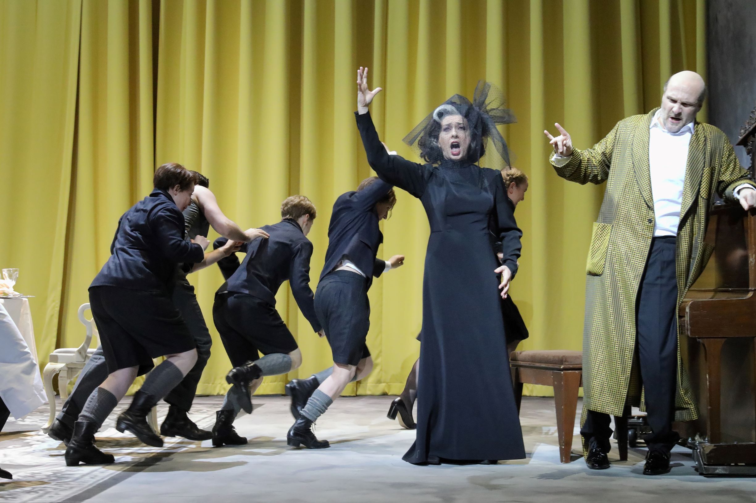 Christof Fischesser sang an extrovert Ochs. His bass was well dispatched in the role, the bottom D full and even, and the voice, even through the small screen, enveloped this listener in its liquid warmth. He threw himself into all that was asked of him in the staging – cradling his bleeding finger, or disappearing inside a bed as he descended to the sepulchral depths of his register. Again, I wish he had done more with the text – surprising, as he’s a singer I have found to be extremely textually aware in the past. He made a decent attempt at the Viennese diphthongs, but I did long for them to be sharper. The remainder of the cast reflected the standards of this, one of the world’s greatest lyric theatres. Johannes Martin Kränzle sang Faninal in a firm baritone, never succumbing to the urge to hector. Wolfgang Ablinger-Sperrhacke and Ursula Hesse von den Steinen sang Valzacchi and Anina with wit and clarity of diction – I’m still wondering why they and Faninal had horns on their heads in Act 2. Galeano Salas sang his arietta as the Italian Singer with ardent generosity and impressive ease on high.