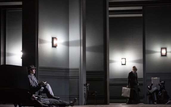 Breth sets the work in a 1950s film noir setting. Bly is a house occupied by shadowy figures – are they ghosts of those who came before, previous Governesses who were scared off? Other valets who may have not lasted the course? Within this world, nothing is what it seems – whether for the Governess or for the children. The set (Raimund Orfeo Voigt) offers constantly changing vistas, yet at the same time never seems to move, making Bly seem both like a physical as well as a mental labyrinth. It’s hard to know what is real and what is in fact imagined, which makes Breth’s staging even more haunting. Characters seem to appear when a closet door opens, as if hidden within, or as a head through a hole in the wall. The presence of the faceless figures reinforces this sense of claustrophobic loneliness, of the cause of an imminent yet unexplainable tragedy.