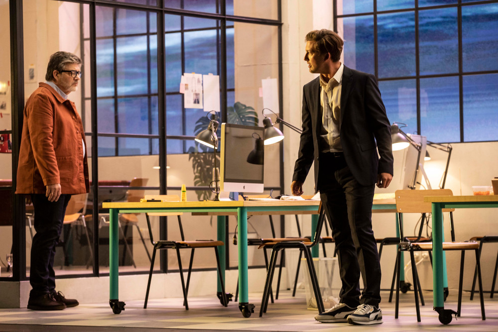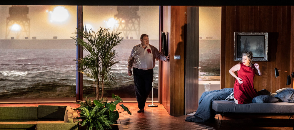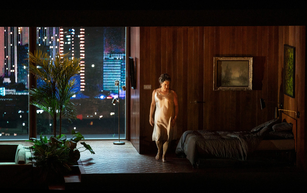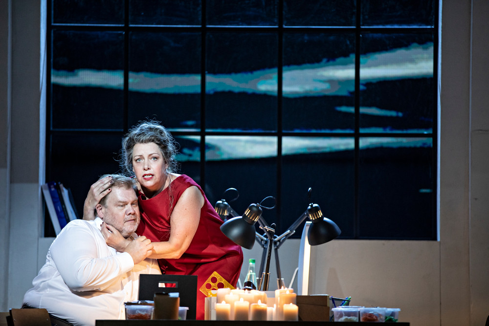 Stone’s staging takes an interesting premise as its starting point. He contrasts the mythical story of Tristan and Isolde with the life of a Parisian woman, potentially a manager in a design agency. Act 1 takes place in her apartment where, as she falls asleep after a dinner party, she’s awoken by the voice of the Seeman, the panoramic vista of Paris, France from her apartment windows turning into video (Luke Halls) of the raging ocean. Act 2, takes place in what appears to be the design agency, where we see doubles of Tristan and Isolde during the love duet, at different stages of their lives and relationships. In the final act, Tristan raves in the Paris métro, surrounded at times by other passengers immune to his plight, at others by Kurwenal and the Hirt alone.