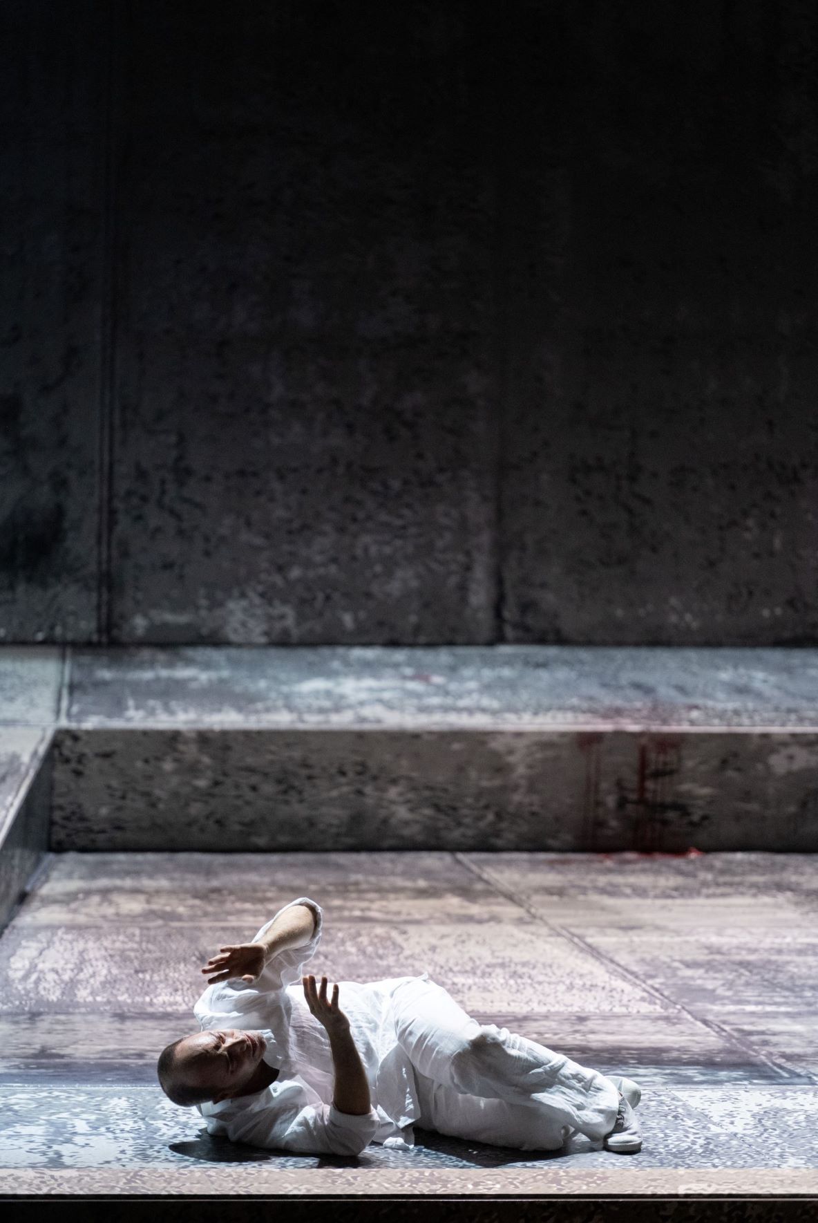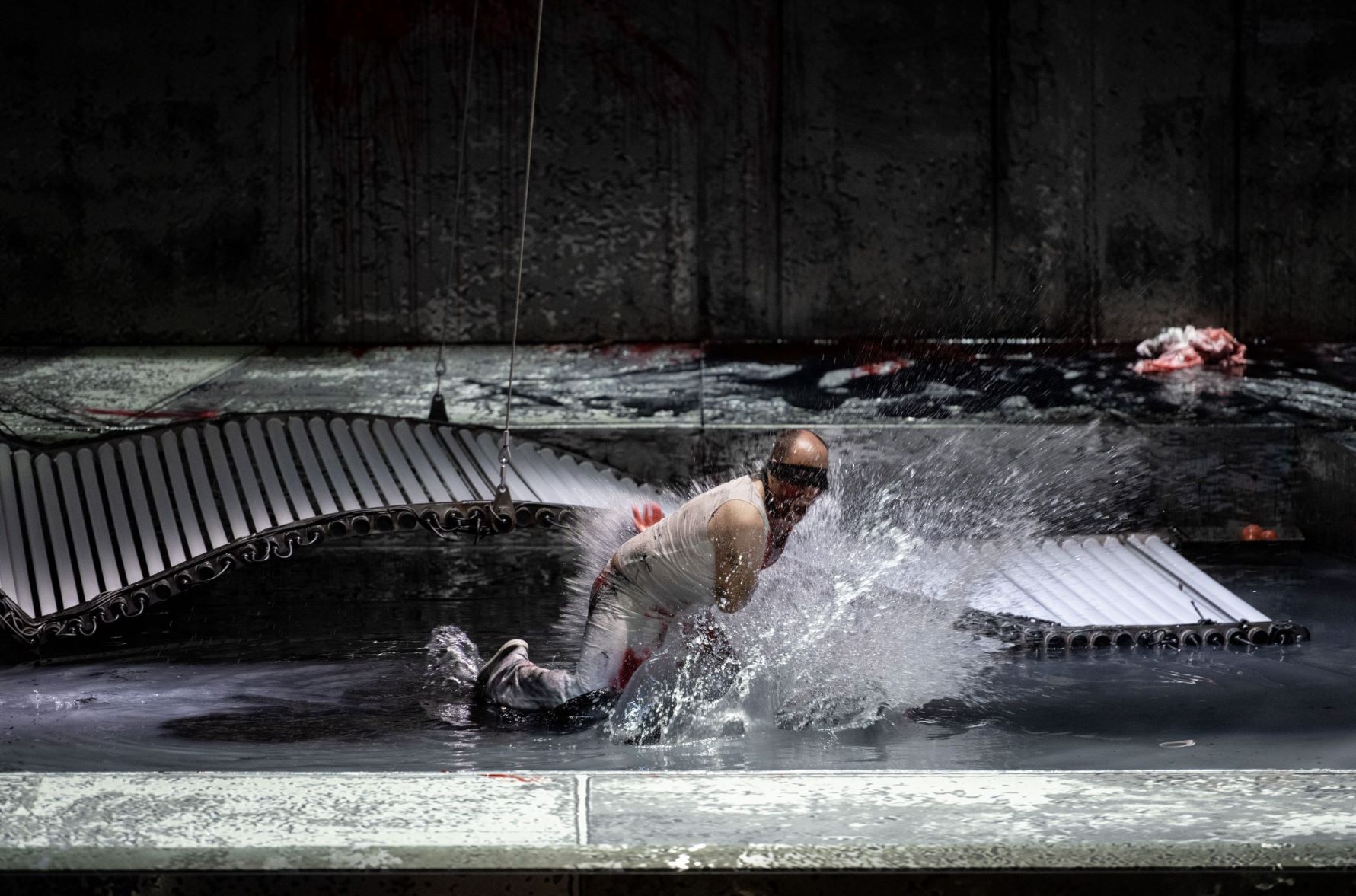 That doesn’t mean that Titov’s staging lacks impact – the sight of Œdipe having gouged his eyes was suitably horrifying, amplified by the choral sound from high up. He also created a haunting stage picture, with Œdipe alone in the pool, his silhouette projected onto the wall behind, reinforcing his loneliness. And yet, I lost a sense of the wider context of the work and its characters. The sense of a world struggling through a plague – how relevant right now – and of how Œdipe’s actions affected those around him. Perhaps, due to our current plague, there was a need to reduce the work to its essence and place the choruses away from the main stage. Yet while Titov’s staging does provide a burst of theatrical energy, it felt that we were only getting a fragment of the work rather than the whole thing.