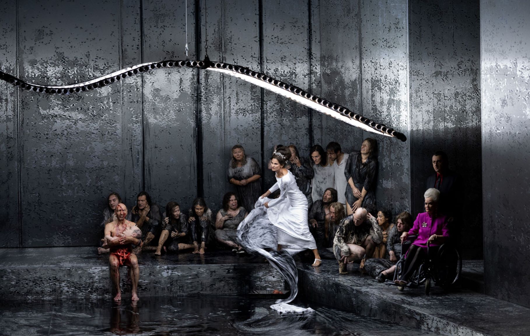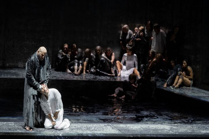 Perhaps also due to the current sanitary restrictions, the choruses were placed around the highest balcony in Evgeny Titov’s production, singing into the auditorium, while on stage the principals acted out the action with the aid of a group of extras. The set (Rufus Didwiszus) was an impressive steel encasing structure, set around a central pool, intimating from the very start the fact of the inevitability of Œdipe’s fate. The effect of the chorus singing as if commenting on the action worked well to an extent, but I must admit to missing the effect of a mass of individuals expressing jubilation or horror as required, and the wall of sound that would come as a result. The production cut around 40 minutes of music, and the effect was to really concentrate the action on the central character, removing the societal implications and making this a much more intimate piece than the cast of thousands sprawling epic that it is at its core.