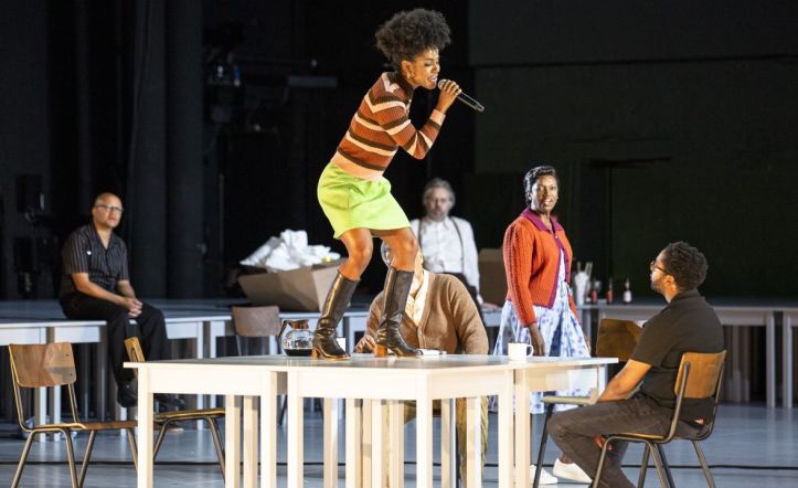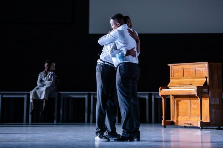 Ted Huffman’s staging deals with the complexities of changing eras, as well as the presence of characters who had already passed away, by setting the action in an empty space, with tables ranged around the stage. These were used as occasional props or thrown around when it came to the Los Angeles riots. Direction of the principals was naturalistic, characters engaging with each other in life, or walking around in a trance-like state when dead. It had clearly been fluently rehearsed. Video (Pierre Martin) was used to add historical context or images of Jonah and Joey as children. The staging worked well enough, but did feel like something of a workshop perhaps, rather than a finished project – but again, this was an intelligent way to be able to portray the passing of time in an efficient way.