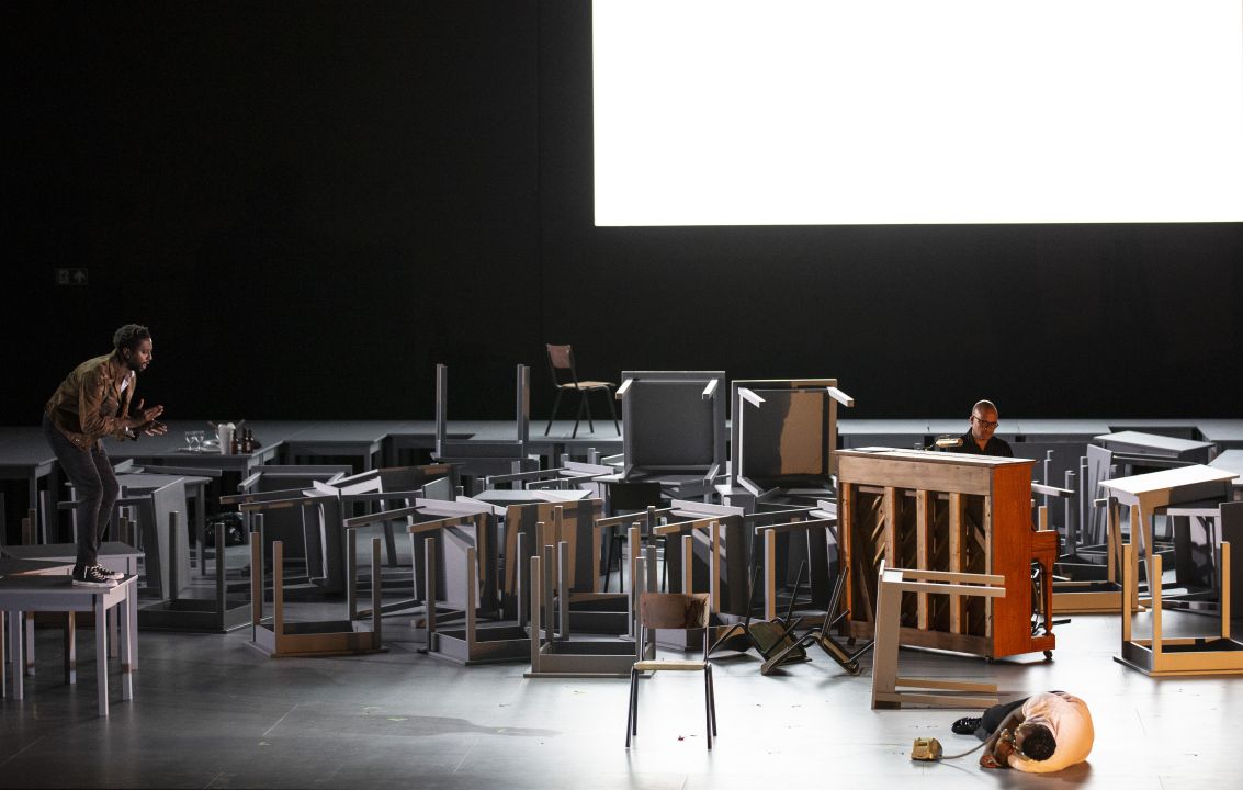 Defoort, and his librettist Peter van Kraij, have created a compelling narrative, one that crosses decades chronologically, taking in major events in US history. The score also constantly crosses genres musically. The Strom family is one where music is a constant presence – both sons, Jonah and Joey, are talented musicians. In time, Jonah becomes a professional tenor, specialized in early music, while Joey uses his talent to teach children how to sing. The daughter, Ruth, becomes implicated in social action, becoming a member of the Black Panthers and loses her husband to police brutality. Defoort illustrates the passing of the time musically, with references to Bach, Puccini, Purcell, and others woven into his score, written for chamber orchestra and jazz ensemble. I left the theatre, not entirely convinced by Defoort’s score. Thematic ideas seem underdeveloped, picked up and quickly discarded, the diversity of cultural influences in the score makes for an interesting sound world. Yet the way that the musical material seems so fragmented, as if afraid to take an idea to a logical conclusion, makes the score feel episodic and lacking in direction. Where Defoort does take ideas and develop them, the evening takes wing and becomes utterly compelling. For instance, when Jonah visits Joey and Ruth’s school, where Joey is teaching his students a version of Purcell’s Music for a While, which then develops into a full-on jam session, the music takes on a personality of its own, the rhythmic impetus irresistible and the melodic material taking life. Indeed, twelve hours later I still have it on the brain. Word setting is not always perhaps the most inventive – characters frequently switch between speech and song, but usually the song follows the same melodic patterns. When the orchestration was particularly thick, there were times where the principals were inaudible from my seat at the front of the Parterre.