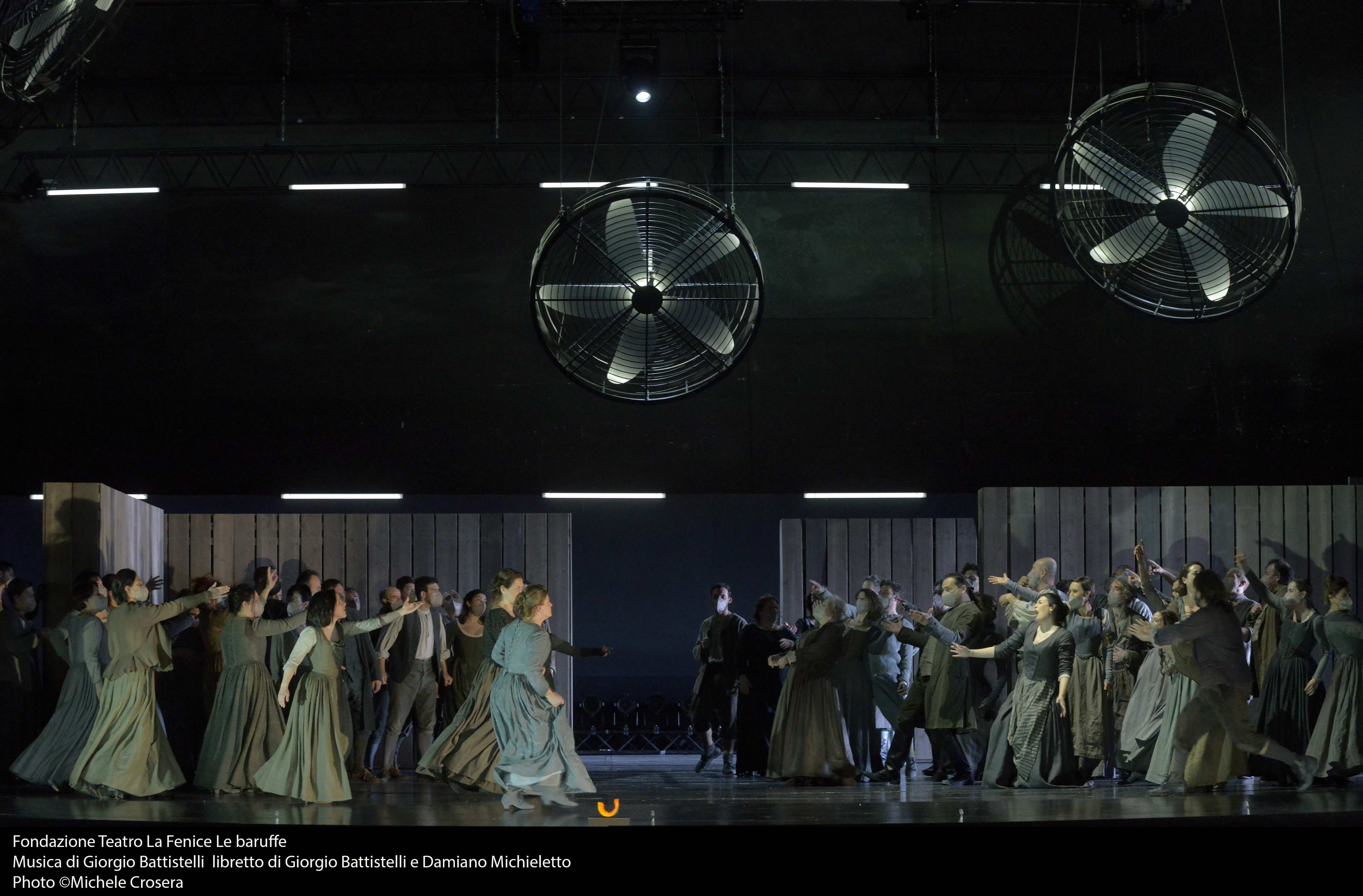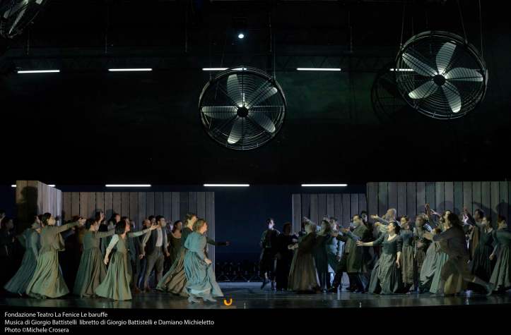 Freely based on Carlo Goldoni’s 1762 play, Le baruffe chiozzotte, Battistelli co-wrote the libretto with the stage director Damiano Michieletto. They use Goldoni’s Venetian dialect with surtitles above the stage in Italian and English. The action takes place in the lagoon village of Chioggia, where characters spend most of the evening mocking, brawling, and eventually flirting with each other. It’s a large cast, with 14 principal roles in a running time of around a hundred minutes, combined with the full chorus and an orchestra consisting of a generous quantity of percussion. Battistelli combines frequent percussive edges, using piano and harp also like percussion, with hazy string clusters. The orchestral writing consists of recurrent brassy jabs, with woodwind occasionally commenting on the textures through florid interjections. The presence of two accordions adds a piquant tinge to the orchestral sound. The chorus is used imaginatively, whether in the opening scene adding disembodied voices from around the room, or by adding a wall of sound as the work approached its dénouement – the commitment and tuning of the Fenice chorus was second to none. I found Battistelli’s work to be interesting. The sound world felt darker, more serious, than the text would suggest, with his writing skirting around the boundaries of tonality rather than within it – although there was one moment where I was expecting him to segue into La Valse. His vocal writing consisted of some significant leaps, exploring the extremities of the registers, with some of the cast sounding rather more taxed than others.