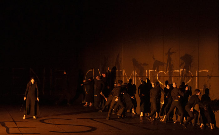 Robert Carsen’s staging is a known quantity. Indeed, I saw it around a decade ago in Toronto with Susan Graham in the title role. It was revived here by Christophe Gayral. Carsen sets the action in a black box, upon which a corps of dancers paint the names of Iphigénie, Agamemnon, and Clytemnestre. While the chorus sang from the side of the stage, the dancers constantly interact with the principals, creating constantly-changing stage pictures and reflecting both the pursuit of Oreste by the furies, and also reinforcing the sense of the central trio of Iphigénie, Oreste and Pylade fulfilling a pre-defined destiny. The lighting (Carsen himself with Peter van Praet), also made intriguing use of shadow, particularly at the moment where Iphigénie held up her sword at the front of the stage, while its shadow pointed at Oreste’s head.