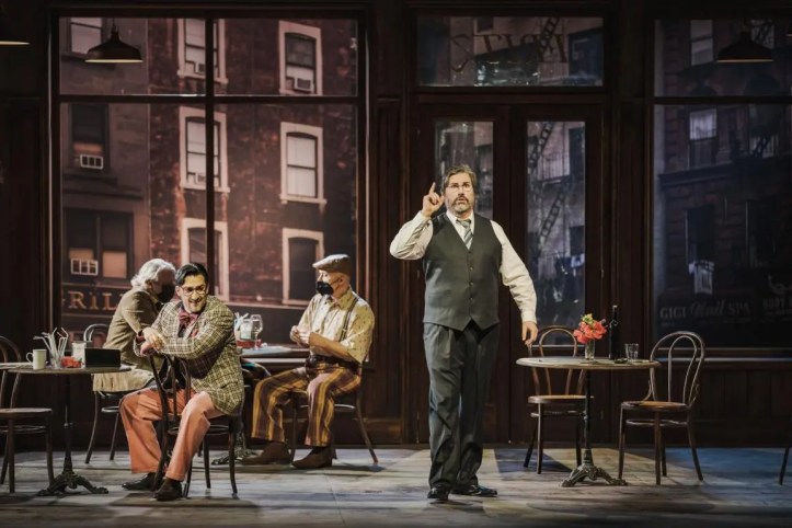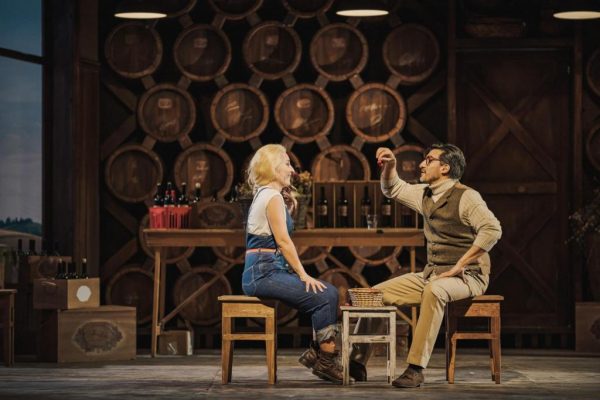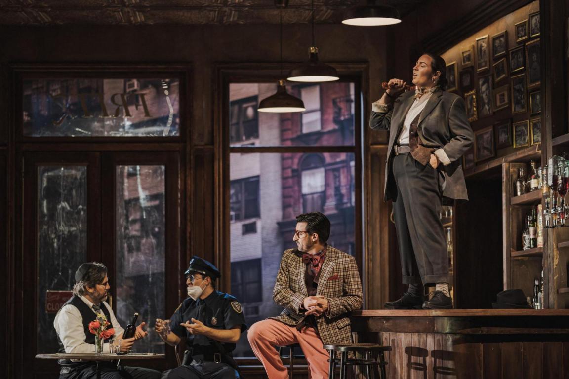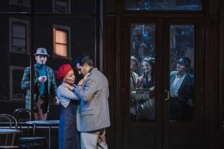 Today’s staging was confided to Rosetta Cucchi. She moves the action from Alsace to the 1980s in the United States, in a cityscape that resembles New York City. Indeed, she makes a few small alterations to the libretto to update the location – Suzel becomes the most attractive girl in America, rather than in Alsace, for instance. Acts 1 and 3 take place in Fritz’s bar, while Act 2 takes place at his vineyard, complete with sprawling vistas of rolling countryside through the window, where the Rabbi and company show up on a golf cart. Cucchi gives the narrative room to work its magic easily, founded on genuine and unmistakable chemistry between the principals, and with a cast who look like they’re having the time of their lives. Indeed, I was fortunate to be sitting towards the front of the auditorium and seeing the vividness of the acting on stage, I felt genuinely pulled into the action, almost forgetting that I was in a theatre, rather than watching a genuinely real scene unfolding before me. There was genuine tenderness between Salome Jicia’s Suzel and Charles Castronovo’s Fritz, the regret and frustration that Fritz clearly felt at the thought of having potentially lost Suzel was utterly palpable, and Castronovo compellingly brought to life Fritz’s realization of having feelings he’d never experienced before. At the end of the evening, the entire ensemble reflected on the wonder of falling in love. Perhaps, it would have been nice had Cucchi challenged the work’s heteronormativity and made Hanezò and Federico into a couple, rather than having them seemingly pair off with a pair of anonymous female extras. That said, Cucchi gives us a wonderfully uplifting show.