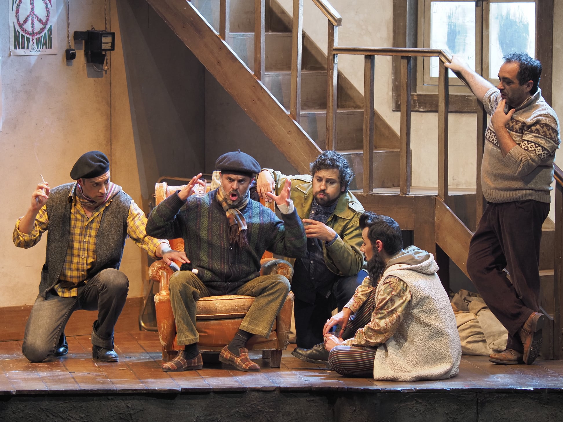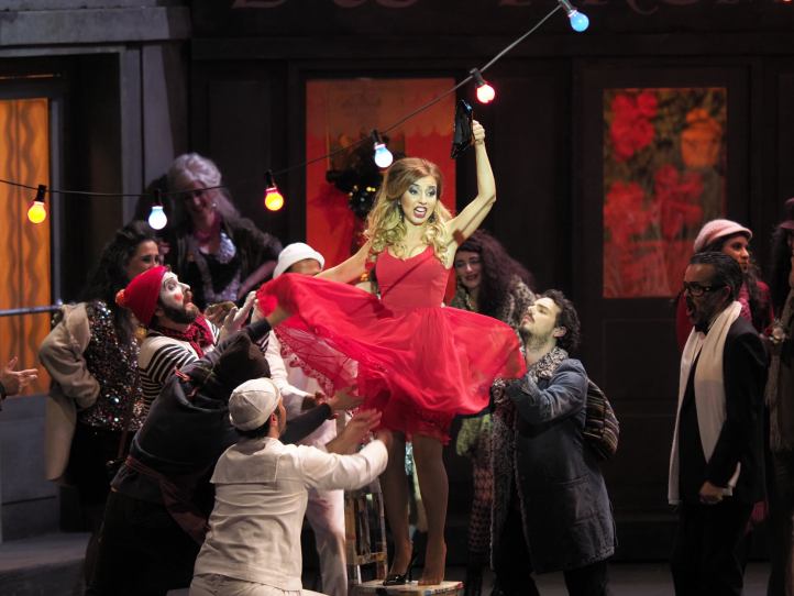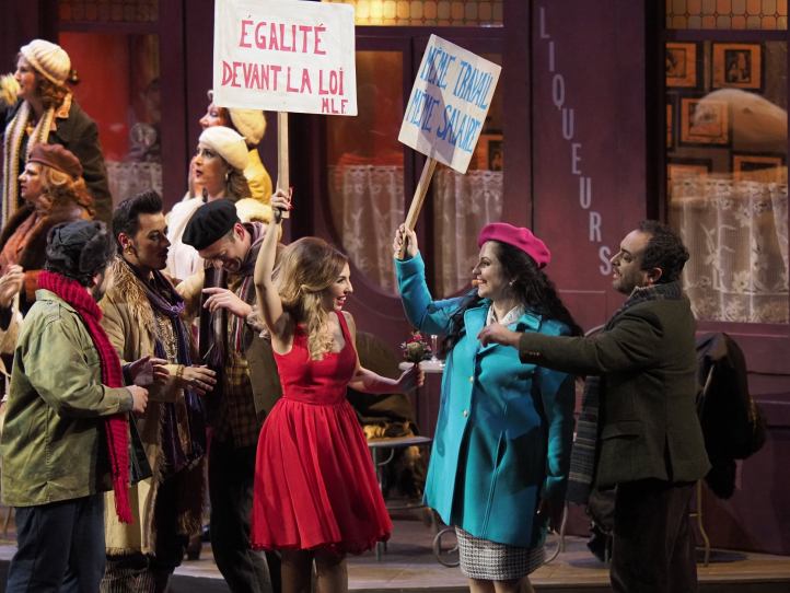 Sagi’s staging of Bohème is the best thing I’ve seen from him. He ideally manages to encapsulate that combination of the sheer joyfulness of the first two acts, with the tragedy of the second half of the evening, populating the stage with genuine flesh and blood characters. Sagi updates the action to 1960s Paris, a time of turbulence, encapsulated by the women with banners harassed by police as they try to block the parade at the end of Act 2. What Sagi also does, is make clear that first encounter between Mimì and Rodolfo is far from being an accident – Mimì is seen listening to the group as they head out for the night and chooses her moment to visit Rodolfo carefully. There’s a tenderness and truthfulness between Natalia Tanasii and Gianluca Terranova’s Mimì and Rodolfo that I found utterly believable. Similarly, at the start of Act 4, the chemistry between Terranova’s Rodolfo and Christian Luján’s Marcello is so convincing, clearly two close friends who genuinely care for and appreciate each other. The moment that Diogo Oliveira’s Schaunard realizes that the life has ebbed away from Mimì is so vivid, particularly so when we can see the realization spread among the remainder of the cast.