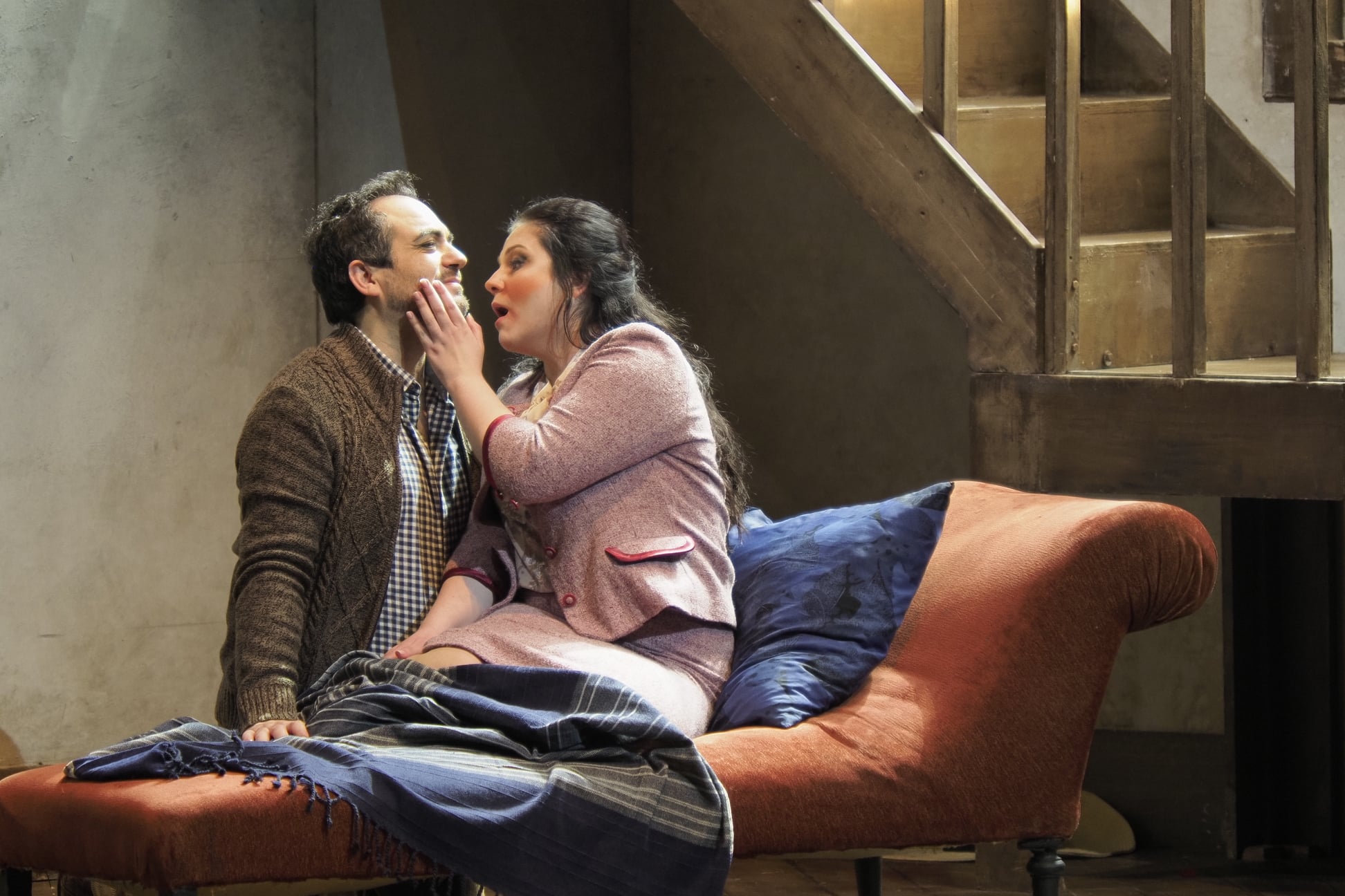 Tanasii brought her bright, well-placed soprano to the role of Mimì. She had no problems in soaring over the Puccinian orchestra, the voice had wonderful reach on high, the silvery tone ringing out with ease. She’s also an engaging actress, with a highly expressive face. There was a touching hopefulness to her expression as she had her first encounter with the Rodolfo. Her sung Italian is clear, but some of the vowels are slightly exotic and she could have made more of those distinctive double consonants. There was a sense perhaps, that she had fully learned the role but doesn’t quite live it yet. It was very well sung and had much to offer, but I left with a sense that Tanasii will bring even more to the role in years to come. Undoubtedly an artist to watch. Terranova sang Rodolfo in a wonderfully Italianate tenor, full of sunny warmth. He used the text wonderfully, using it as a starting point to colour the line and brought the words to such vivid life. The voice, does sound like an instrument that needs to be carefully managed – his legato has a tendency to be lumpy and aspirate-filled and the top can lack body, sounding rather tight. He made the big C in his celebrated number through sheer willpower. He took the closing phrases of Act 1 in unison with Tanasii, which was regrettable as he was definitely a bit short up there. Still, the clarity of his diction, his engaging stage manner and palpable chemistry with his castmates, these are what I will take away with me from this evening.