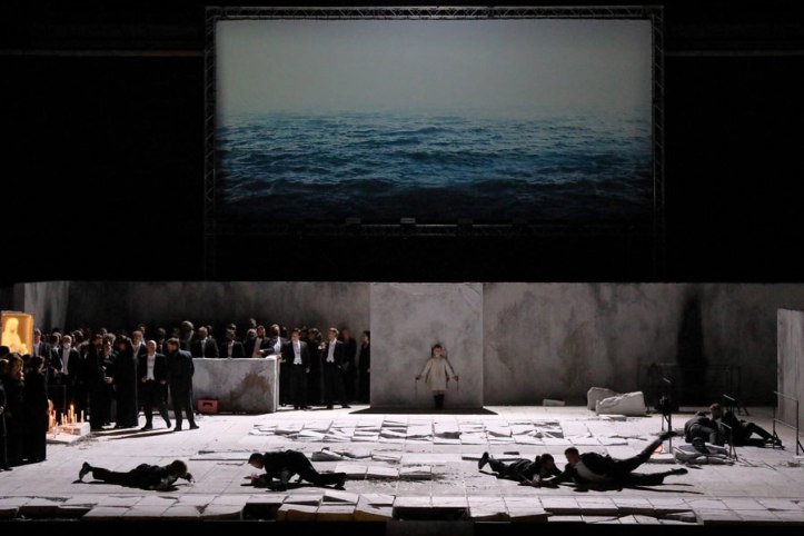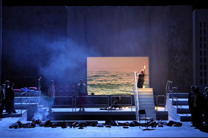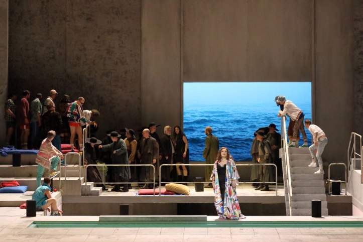 Honoré sets out his vision for the work in an interesting note in the program book. He makes a clear distinction between the war-damaged world of Troy, and the sunny, devoted to leisure, world of Carthage – both reflected in the sets created by Katrin Lea Tag. One, was a war-damaged, dark world, seemingly of endless night; the other, a sun-bleached concrete place of recreation. There was a significant issue with the sets for Acts 1 and 2, in that they appeared to be acoustically dead towards the back, and with some action taking place upstage, voices did have a tendency to get lost in a way that they did not when characters sang at the front. Direction of the principals also consisted of a fair bit of standing and delivering, but Marie-Nicole Lemieux’s Cassandre and Stéphane Degout’s Chorèbe did what they could to inject tangible characterization and drama. There was no horse, instead a sign indicated ‘Das Pferd’, perhaps reinforcing an idea that what damages us is our own fears and that by believing the worst it can come true.